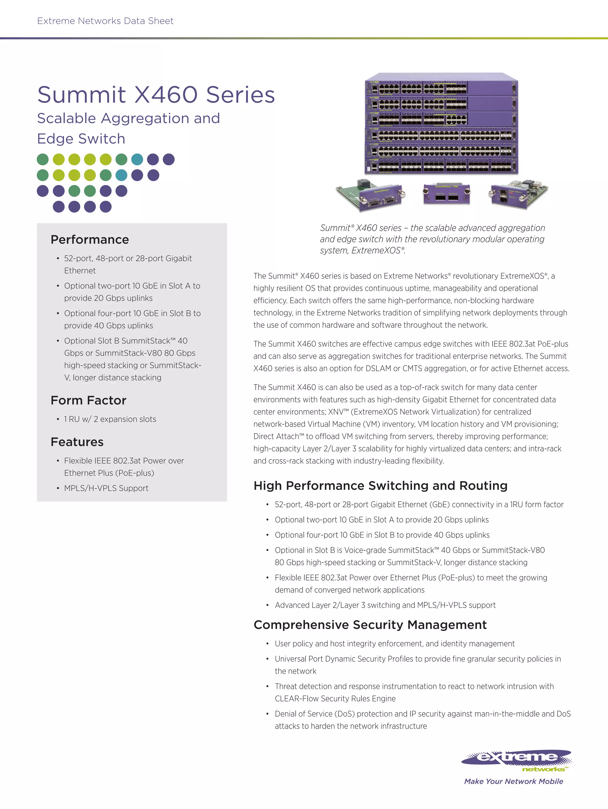 The document describes the Summit X460 series switches from Extreme Networks. The switches offer 52, 48, or 28 port Gigabit Ethernet connectivity in a 1RU form factor with optional 10GbE uplinks. They are based on ExtremeXOS, a highly resilient operating system. The switches can be used as campus edge switches, aggregation switches, or top-of-rack switches in data centers. They support features like PoE+, MPLS, stacking, security, and virtualization.