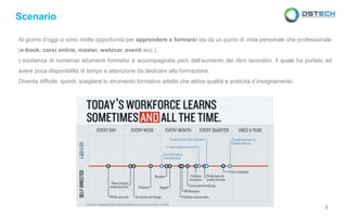 Il documento tratta delle opportunità di e-learning disponibili per la formazione personale e professionale, evidenziando la difficoltà nella scelta di strumenti efficaci a causa dei ritmi lavorativi elevati. Viene offerto supporto attraverso una piattaforma innovativa che propone percorsi formativi brevi e personalizzati, con assistenza continua e valutazioni per migliorare le competenze. L'approccio include pillole formative di facile fruizione, strumenti di assessment e interazione per garantire un'esperienza d'apprendimento coinvolgente e mirata.