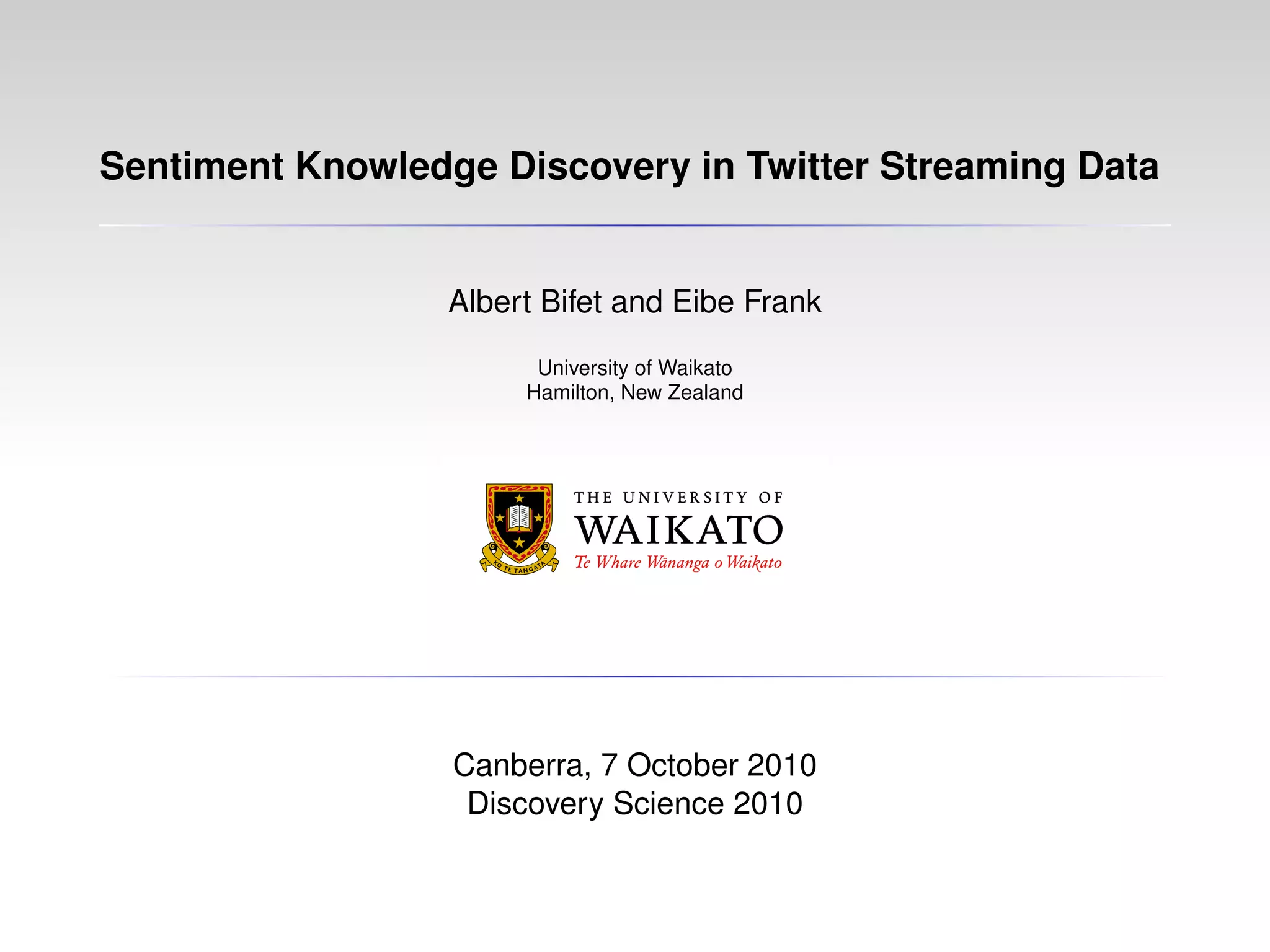 This document discusses the methods and empirical results of sentiment analysis on Twitter's streaming data, emphasizing real-time predictions and sentiment classification techniques. It highlights various data mining methods such as multinomial naïve Bayes, stochastic gradient descent, and Hoeffding trees, alongside evaluation metrics like kappa statistics. The results demonstrate the effectiveness of these techniques in classifying sentiments based on a collection of tweet data, providing insights into user emotions and engagement.