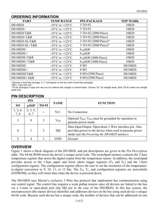 The DS18B20 is a digital thermometer that can measure temperatures from -55°C to +125°C with a resolution of 9 to 12 bits. It communicates over a single wire bus and can be powered directly from the data line without an external power supply. Each device has a unique 64-bit identification number and the devices can be used to monitor temperature at multiple locations connected to the same data line.