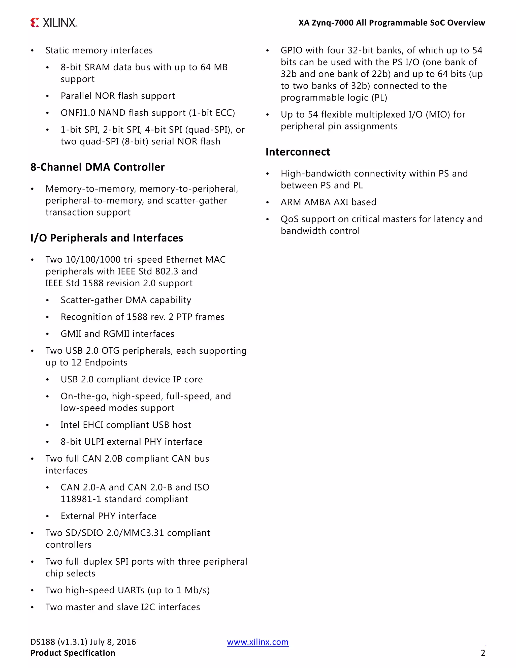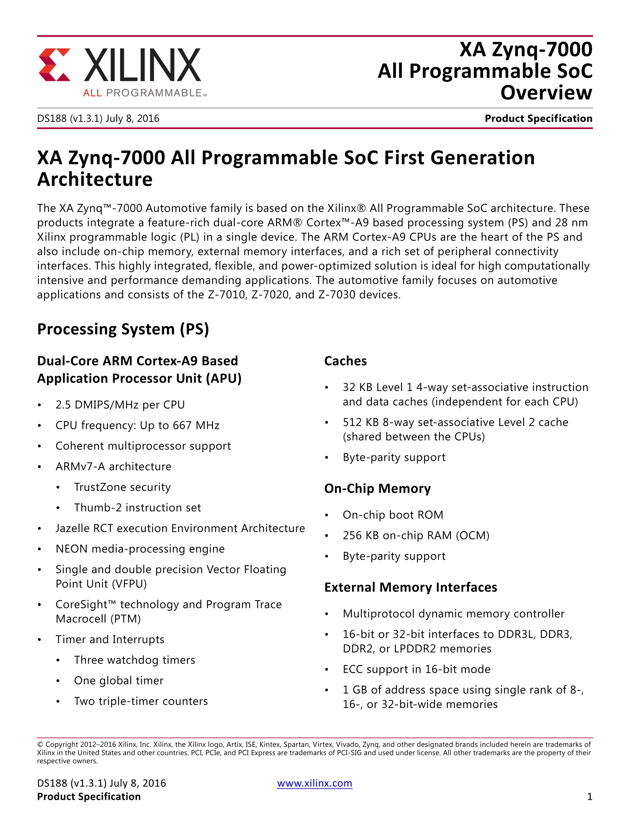 The document describes the XA Zynq-7000 All Programmable SoC, which integrates a dual-core ARM Cortex-A9 processor and programmable logic. The processor system includes the application processor unit with two 667MHz Cortex-A9 cores, on-chip memory, external memory interfaces, and peripherals. It connects to the programmable logic through high-bandwidth interfaces. The programmable logic contains logic resources like LUTs and block RAM, as well as DSP slices. The SoC provides processing system and programmable logic integration in a single device for applications requiring both processing and custom logic.