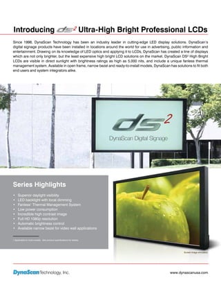 DynaScan Technology introduces its new High Bright Series of ultra-high brightness professional LCD displays. The displays utilize LED backlighting and local dimming to achieve brightness ratings as high as 5,000 nits, making them visible in direct sunlight. They also feature a unique fanless thermal management system. The displays are available in various sizes from 46 to 65 inches with open frame, narrow bezel, and integrated models. They are suitable for both indoor and outdoor applications such as retail stores, kiosks, and digital signage.