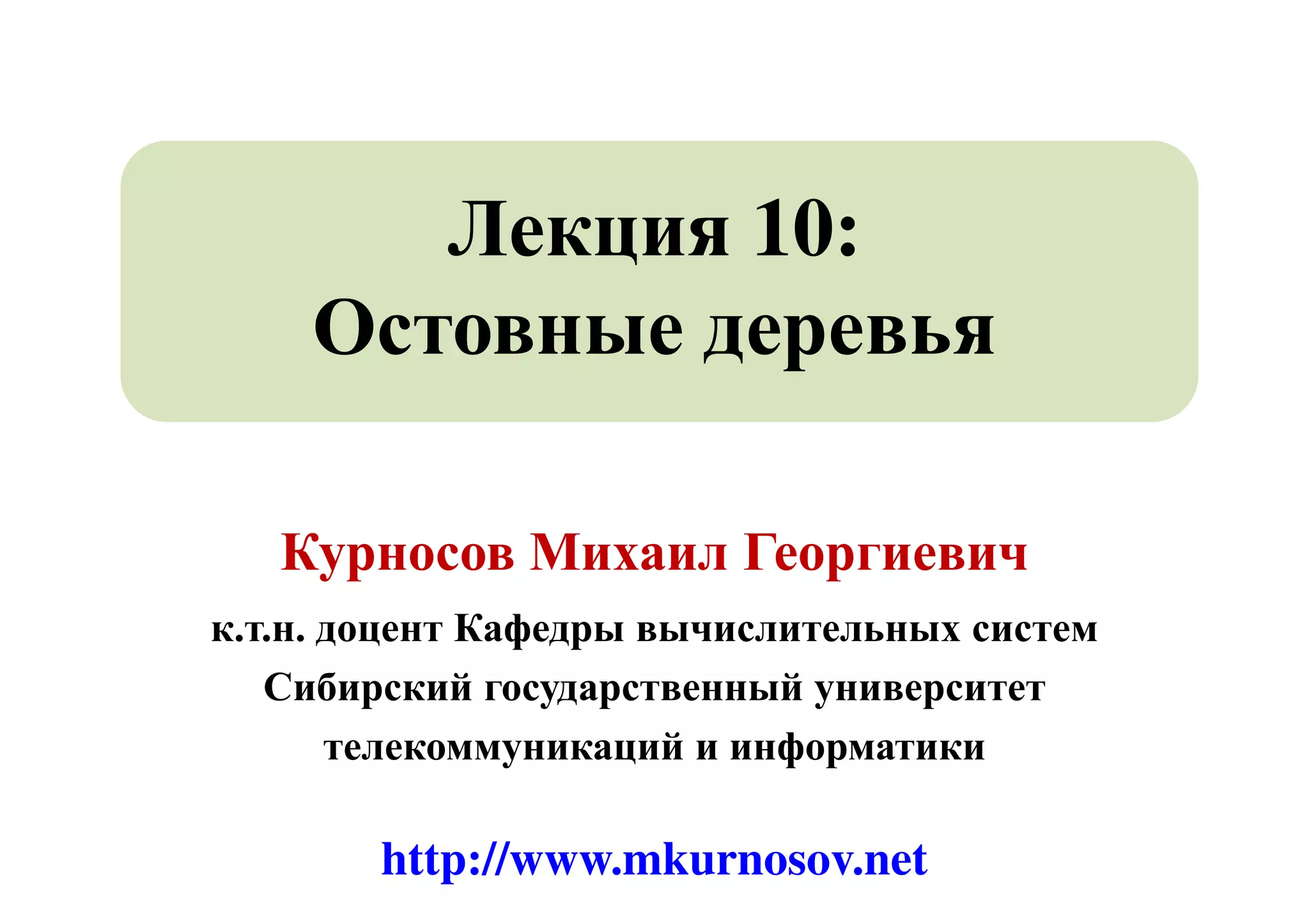 Документ содержит лекцию о остовных деревьях и алгоритмах для их построения, включая алгоритмы Крускала и Прима. Рассматриваются сложности по памяти различных алгоритмов, а также применение остовных деревьев в телекоммуникационных сетях. Кроме того, поясняются структуры данных, такие как система непересекающихся множеств, необходимые для реализации этих алгоритмов.