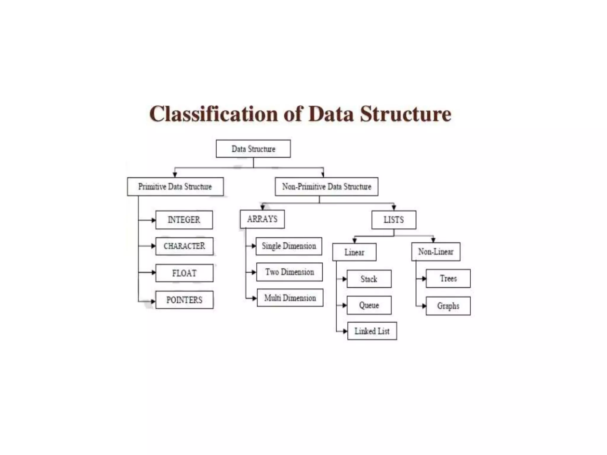 The document discusses data structures and their classification. It defines data structures as a systematic way to store and organize data for efficient use. Data structures can be primitive or non-primitive. Primitive structures are basic data types like integers while non-primitive structures are composed of primitive types, like linked lists. Data structures are also classified as linear or non-linear. Linear structures like arrays and linked lists arrange data in a sequence while non-linear structures like trees represent hierarchical relationships. Common linear structures discussed are stacks, queues, and linked lists and non-linear graphs and trees are also described.