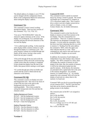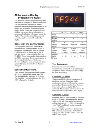 The document provides instructions for programming alphanumeric displays with graphics capabilities. It describes text commands for writing text to the display, scrolling text, setting text and background colors, and writing display information to and from memory. Graphics commands are also covered for placing graphics on the display using binary or ASCII codes. The document details three display configurations and connection via RS422, and explains the display's configuration button functions.