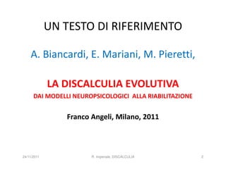 La discalculia è un disturbo delle abilità numeriche che si manifesta in bambini di intelligenza normale e può essere associata a dislessia. Essa colpisce una parte limitata della matematica, in particolare il calcolo, e si diagnostica escludendo disturbi neurologici o sensoriali. La comprensione della discalculia richiede un'integrazione di fattori biologici e non biologici, e le misure compensative devono essere utilizzate con cautela.
