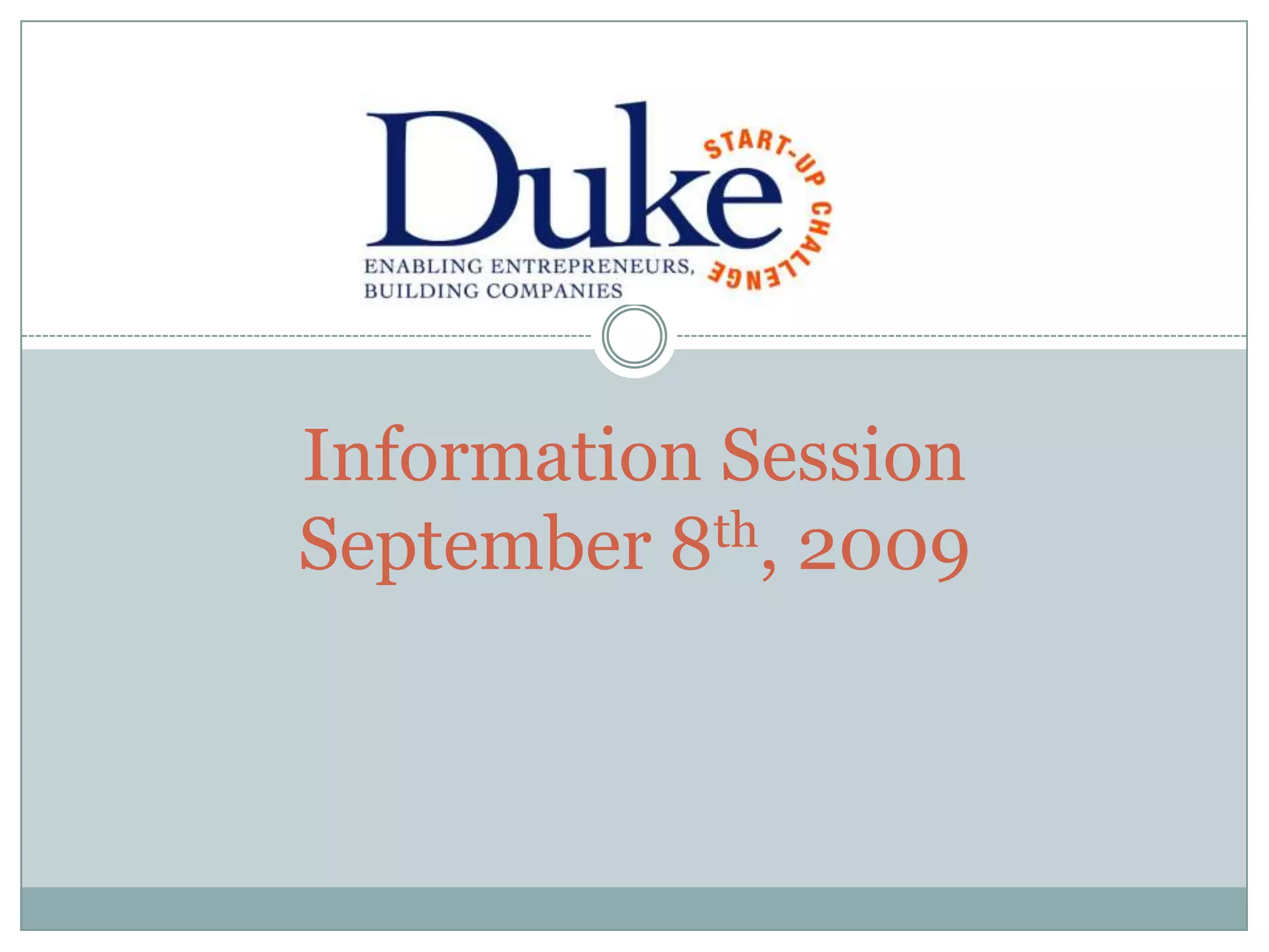 The document summarizes an information session about the Duke Startup Challenge (DSC), which includes an elevator pitch competition and business plan competition across seven tracks. It provides details on the timeline and structure of events from November to April. The organizational structure of the DSC cabinet is also outlined, including responsibilities like marketing, team development, alumni engagement, judging, finance, events, and sponsorship. Applications will be sent out by the end of the week for cabinet positions to help manage the $75,000 annual competition.