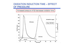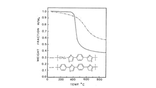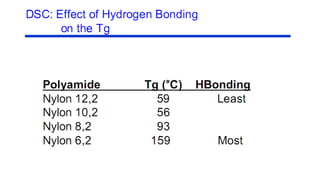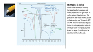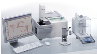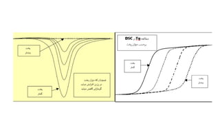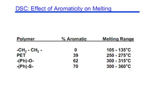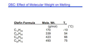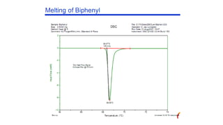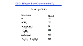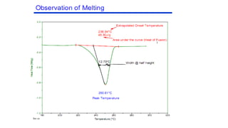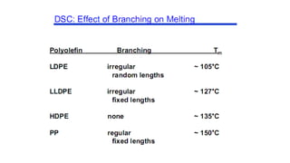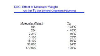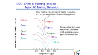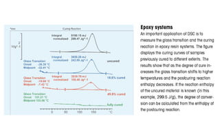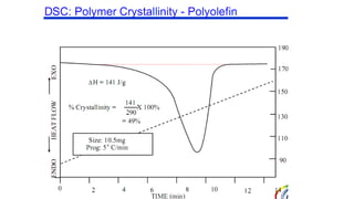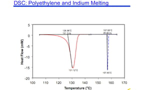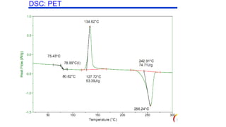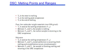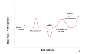 The document discusses differential scanning calorimetry (DSC) and thermal gravimetric analysis (TGA). DSC measures heat flow during phase transitions and can identify glass transitions, crystallization, and melting. TGA measures weight loss from decomposition as temperature increases. Both techniques provide information on thermal properties like heat capacity, transition temperatures, and decomposition temperatures. Samples are heated at a constant rate while measuring properties like heat flow, weight, or gas evolution to characterize materials.