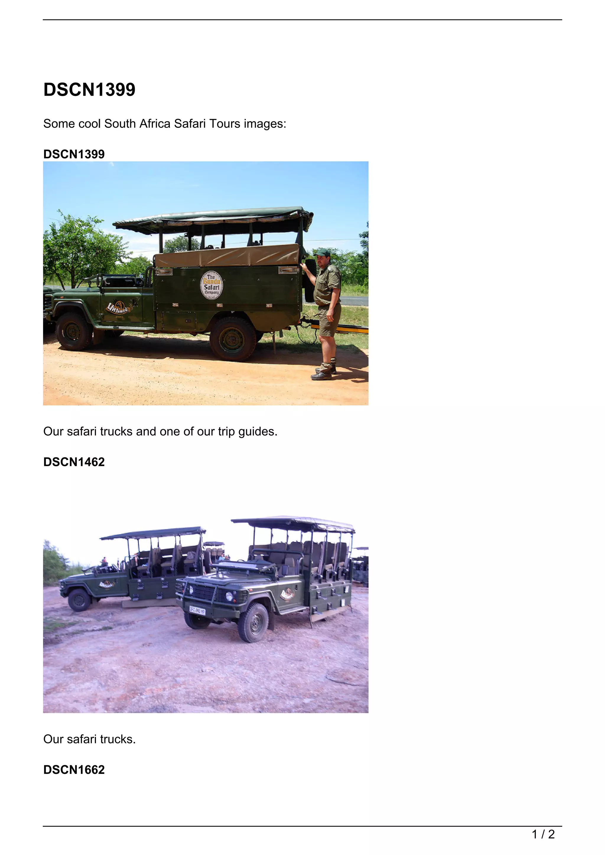 This document features 3 images from South Africa safari tours, including safari trucks and a trip guide stopping by a tree with small round berries. It also provides a link for more information on tours of the South African experience.