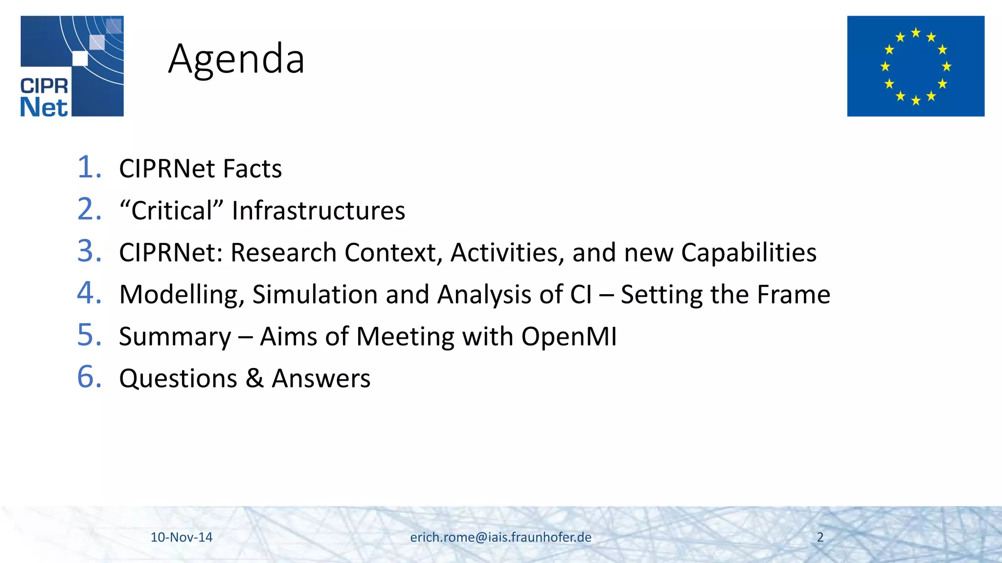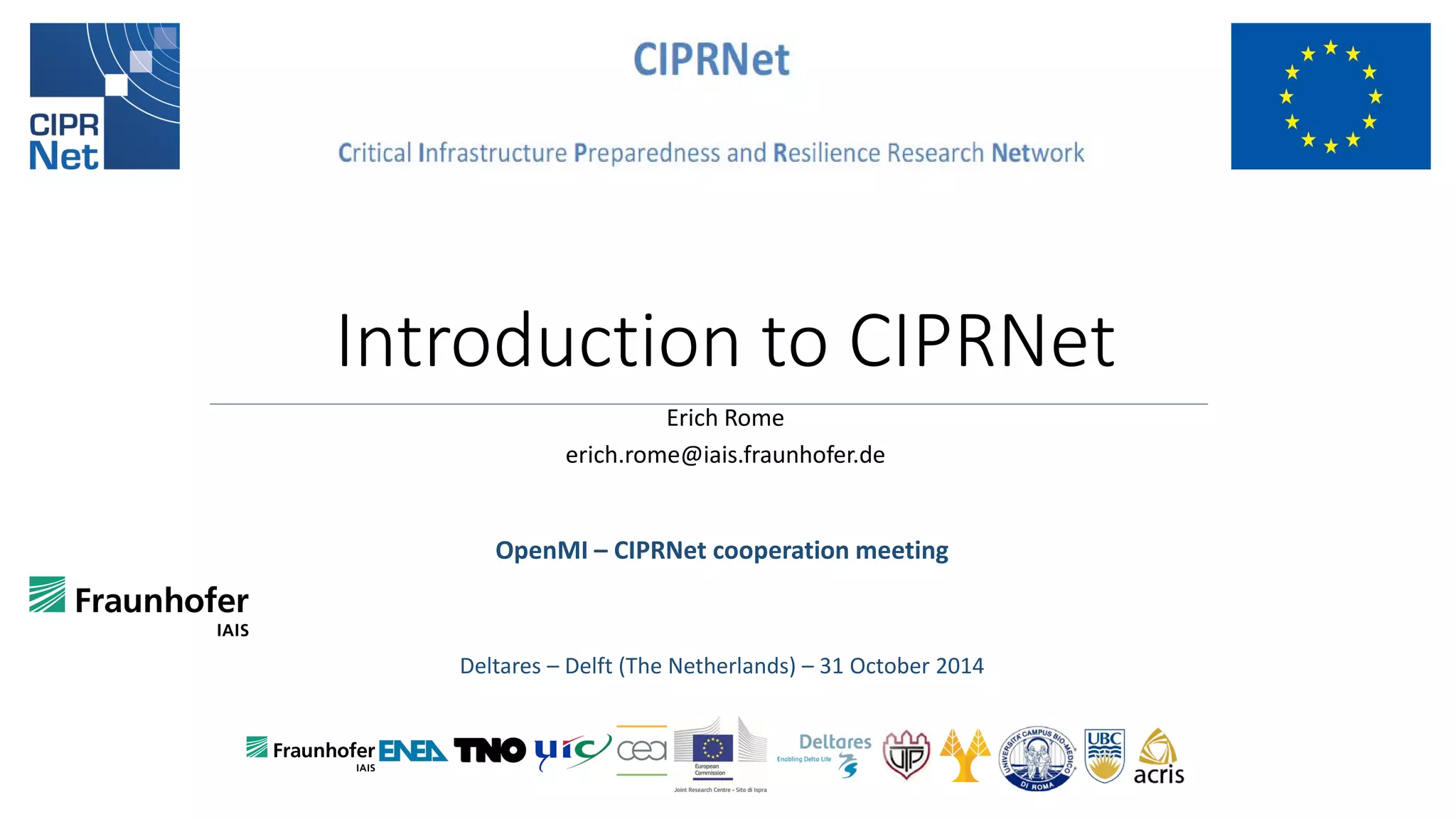 CIPRNet is a European research network funded by the EU to improve critical infrastructure preparedness and resilience. The network aims to deploy new capabilities like advanced decision support and modeling/simulation/analysis of infrastructure interdependencies to support emergency managers. CIPRNet also focuses on community building and establishing a Virtual Centre of Competence & Expertise in critical infrastructure protection. This meeting with OpenMI focuses on collaborating to enhance modeling and simulation approaches for analyzing complex critical infrastructure scenarios.