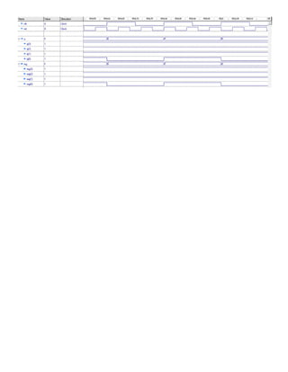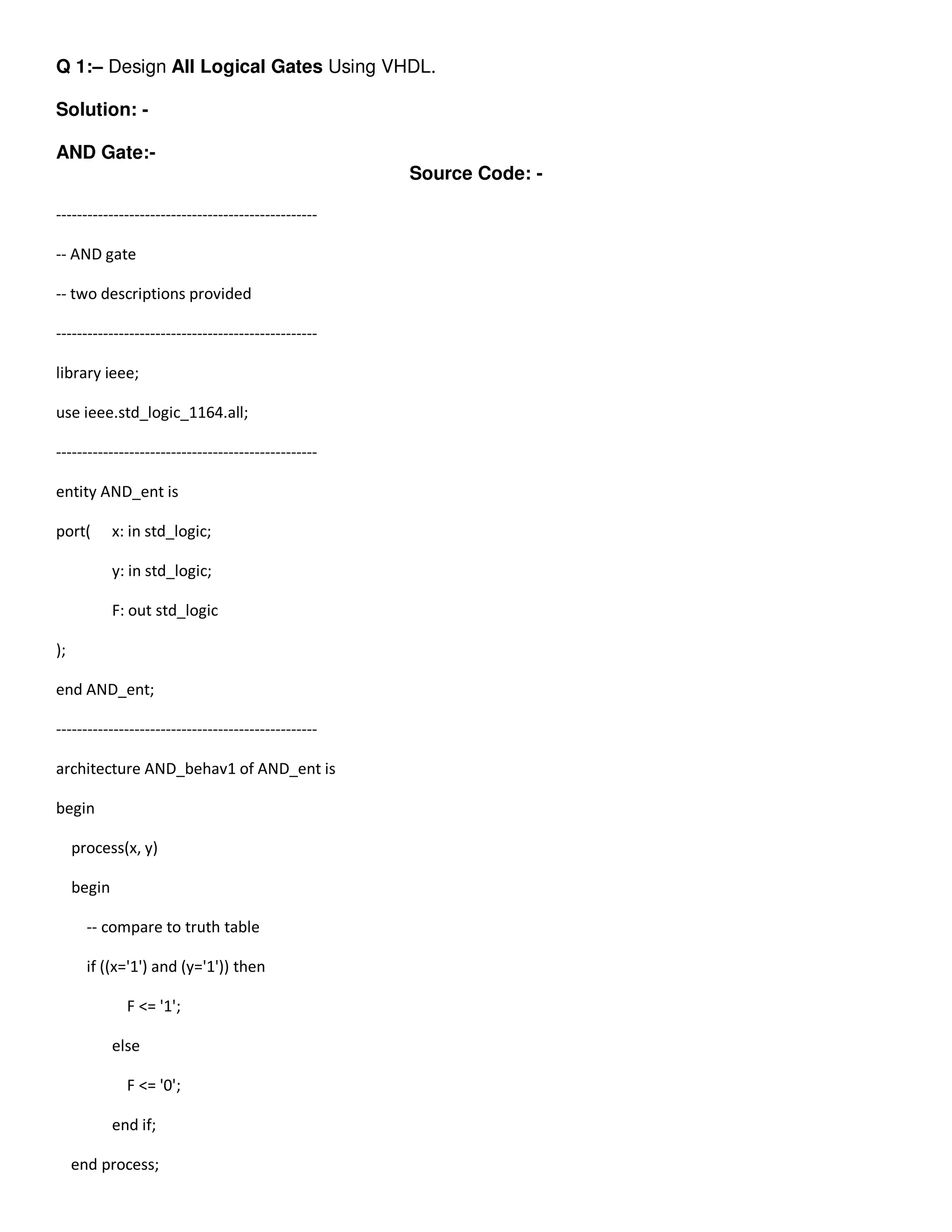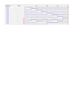 This document provides VHDL code for implementing various logic gates and basic digital circuits. It includes code for AND, OR, NOT, NAND, NOR, XOR and XNOR gates. It also provides code for half adder, full adder, multiplexer, demultiplexer, decoder, encoder, comparator, BCD to binary converter, JK flip-flop, and an n-bit counter. For each circuit, the VHDL code and a sample waveform output is given. The purpose is to design these basic digital components using VHDL and simulate their behavior.