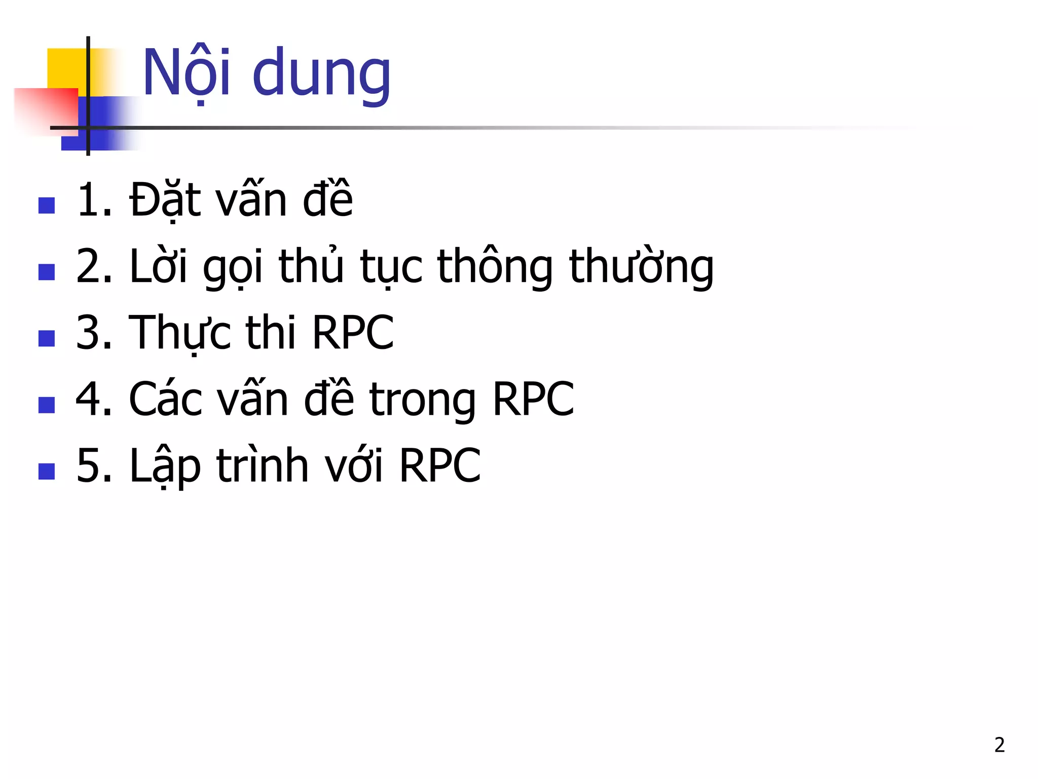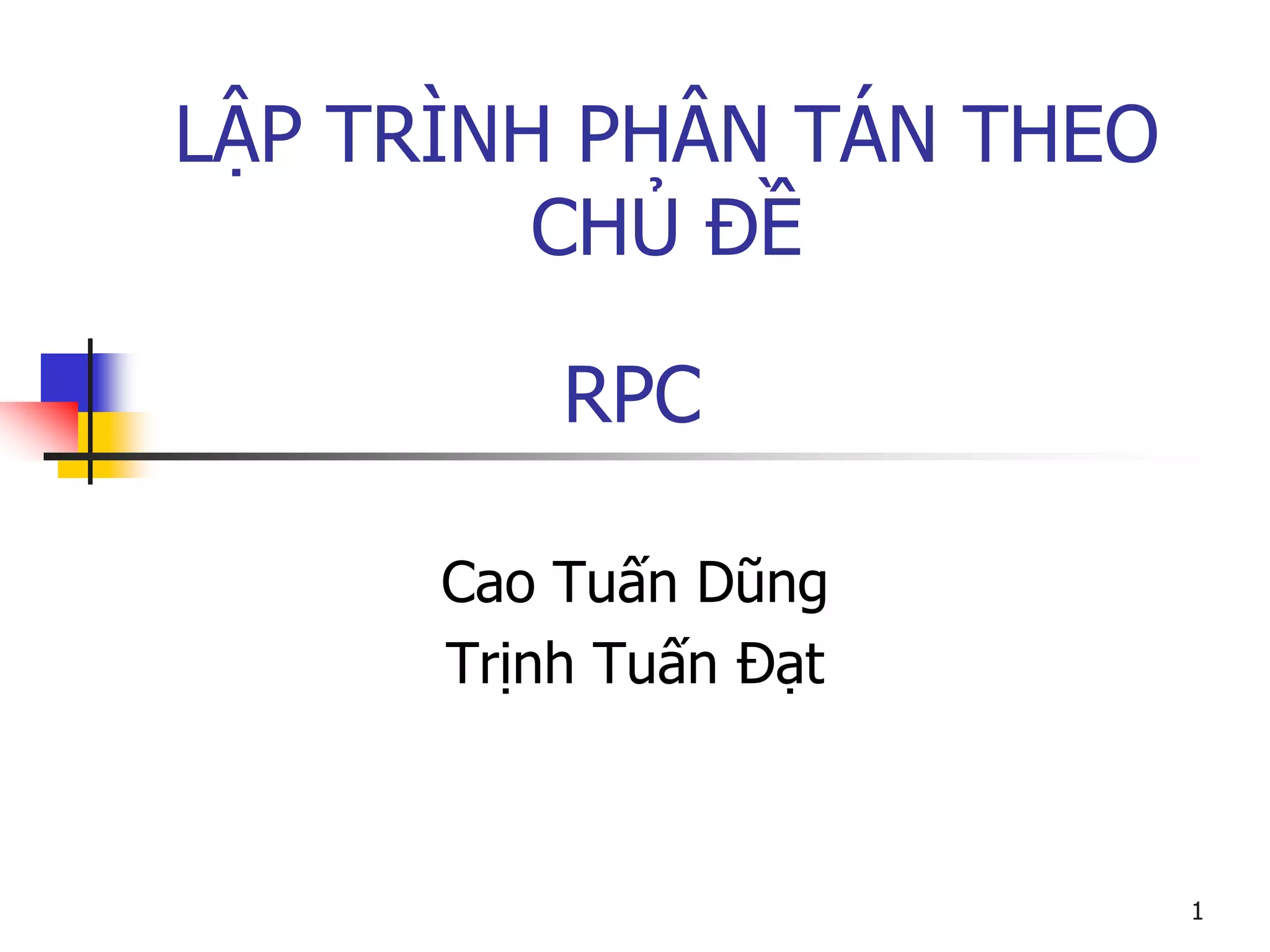 Tài liệu trình bày về lập trình phân tán qua Remote Procedure Calls (RPC), nêu rõ các vấn đề liên quan, từ việc thực thi tới các khó khăn khi truyền tham số và xử lý lỗi. Nó cũng đề cập đến tầm quan trọng của stub và giao thức truyền tải trong việc đơn giản hóa quy trình lập trình phân tán. Cuối cùng, tài liệu thảo luận về cách lập trình với RPC và vai trò của các bộ biên dịch để hỗ trợ ngôn ngữ lập trình.