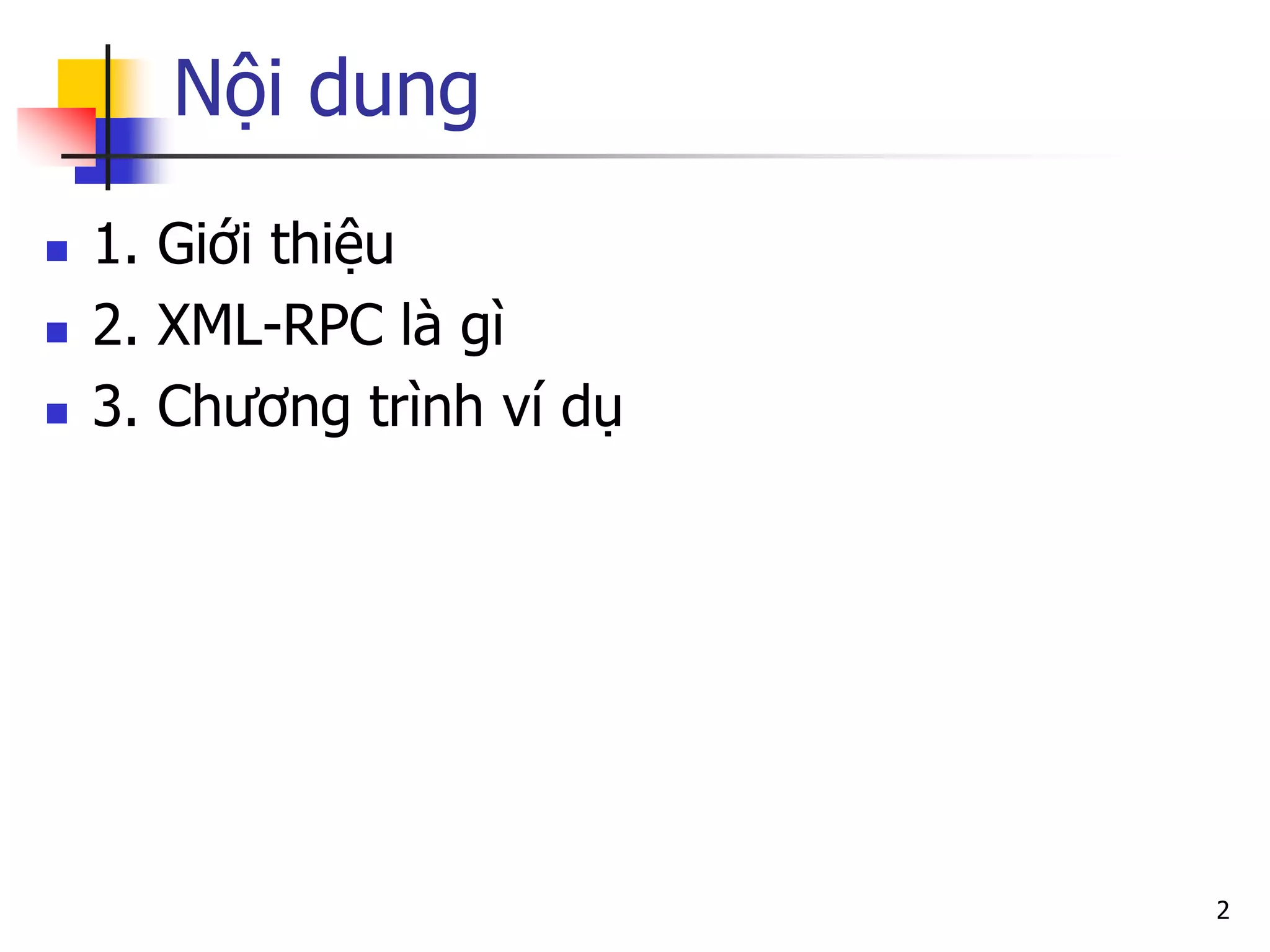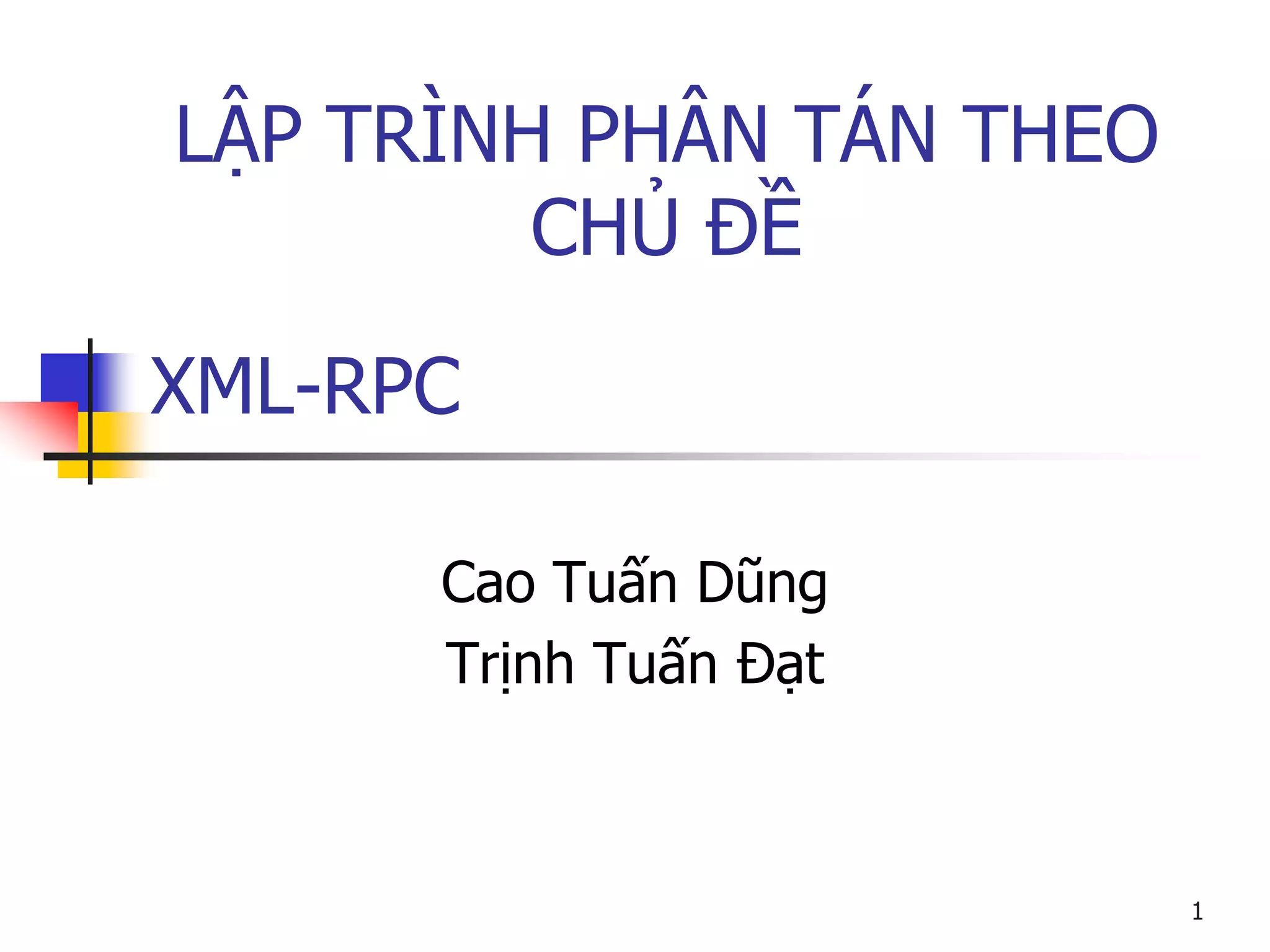 Tài liệu giải thích về XML-RPC, một kỹ thuật cho phép xây dựng ứng dụng phân tán theo mô hình client-server thông qua giao thức HTTP và mã hóa XML. Nó trình bày cách thức lập trình và cách gọi thủ tục từ xa, bao gồm việc truyền và xử lý dữ liệu phức tạp cũng như lập trình ví dụ với Java và C++. XML-RPC hỗ trợ nhiều ngôn ngữ lập trình khác nhau và được thiết kế đơn giản để dễ dàng học hỏi và sử dụng.