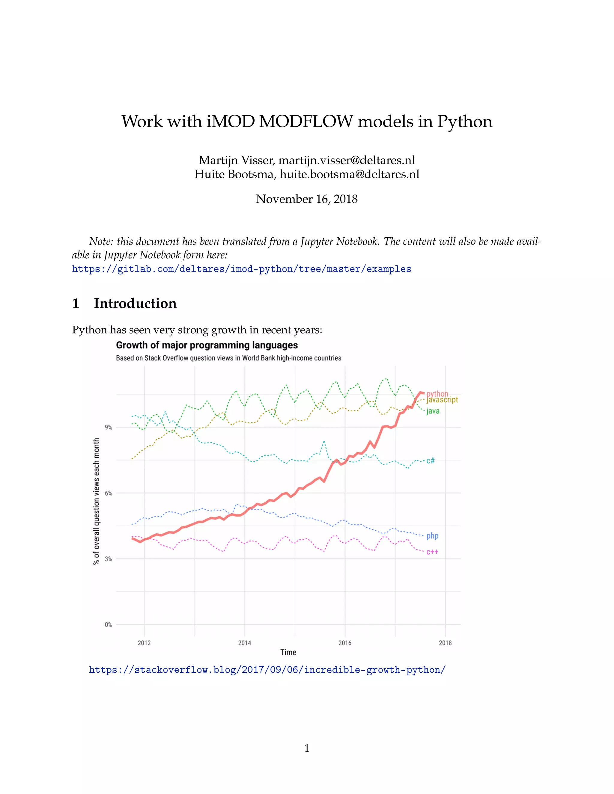 This document provides an overview of using the imod Python package for working with MODFLOW models, highlighting its installation and capabilities for technical computing with libraries like pandas and xarray. It includes a tutorial on converting Excel data to model inputs, building a groundwater flow model, and visualizing results. Key technical details and code snippets are presented throughout to facilitate understanding and implementation.