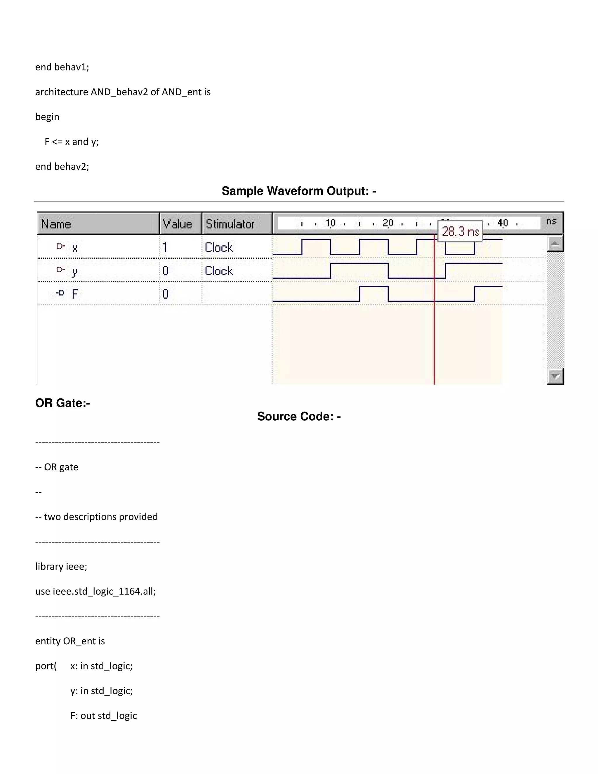 The document provides VHDL code to design various logic gates and combinational logic circuits. It includes code for AND, OR, NOT, NAND, NOR, XOR, XNOR gates. It also includes code for half adder, full adder, multiplexer, demultiplexer, decoder and encoder circuits. For each circuit, it provides the VHDL code along with a brief description and expected output waveforms.