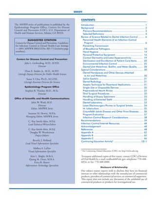 This document provides guidelines for infection control in dental health care settings. It consolidates previous recommendations and adds new ones regarding educating and protecting dental health care personnel, preventing transmission of bloodborne pathogens, hand hygiene, personal protective equipment, contact dermatitis and latex sensitivity, sterilization and disinfection, environmental infection control, dental unit waterlines, and special considerations such as dental handpieces, radiology, parenteral medications, and oral surgery. The recommendations were developed by the CDC in collaboration with other experts and are based on available scientific evidence and expert opinion.