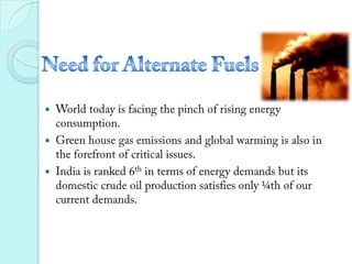 Alternative fuels are needed to meet rising energy demands while reducing greenhouse gas emissions. India relies on imports for 3/4 of its oil needs. Biofuels like biodiesel from palm and jatropha oil and bioethanol from sugarcane offer alternatives. Algal fuels from algae lipids offer high yields without using farmland. Natural gas and biogas can fuel vehicles when compressed as CNG or liquefied, and have lower emissions than gasoline. Electric vehicles powered by batteries or hydrogen fuel cells produce no emissions but have limited range, though fuel cell vehicles could go further. Plastic and emulsified diesel also show potential as alternative transport fuels.