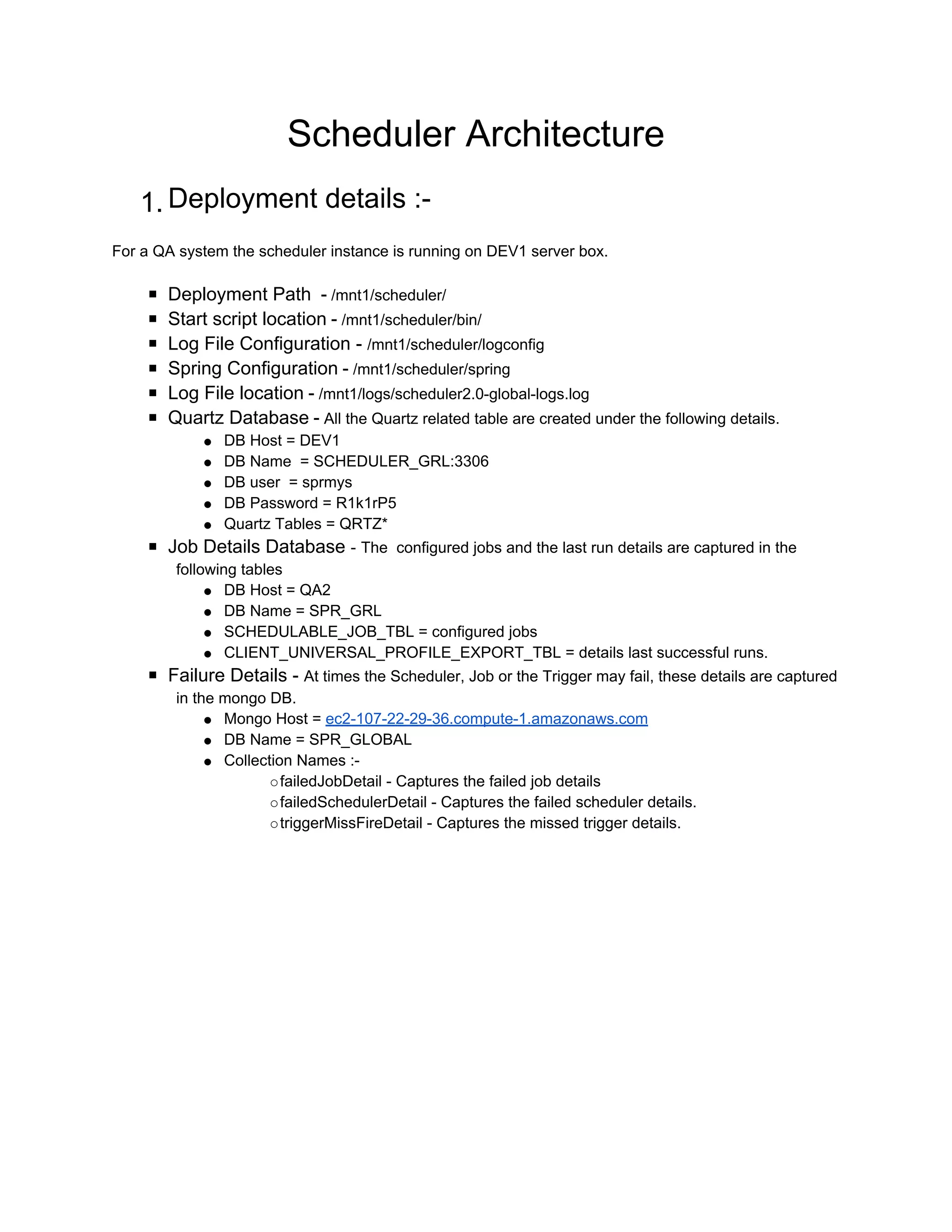 The document describes the configuration details of a scheduler that runs jobs to export social media data from various sources to a universal profile database. It outlines the deployment environment, database connections, configurable jobs, and MySQL tables used to track scheduled jobs and export status. The system job checks for new jobs every 20 minutes and exports occur based on cron expressions for each job. Failure details are captured in a MongoDB database.