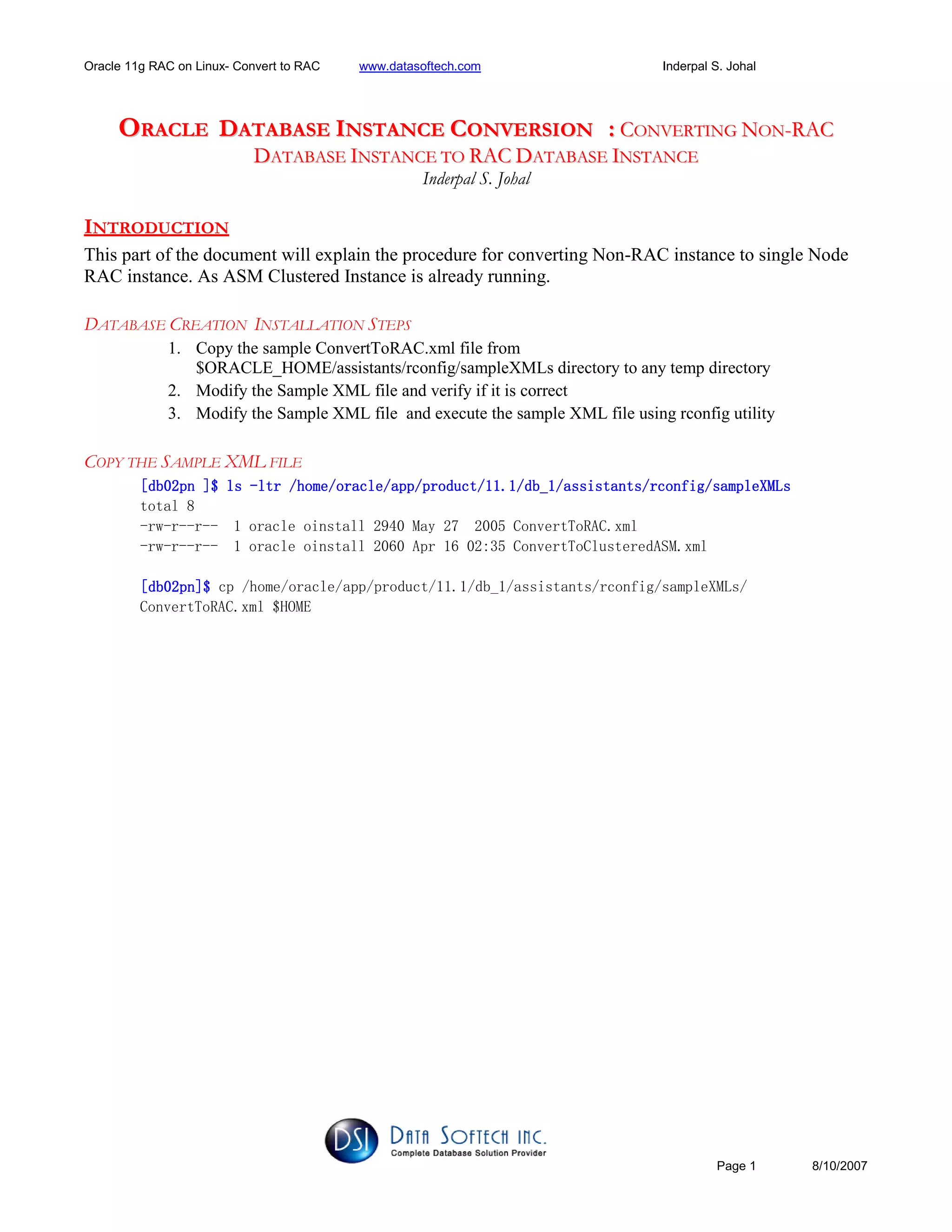 This document provides instructions for converting a non-RAC Oracle database instance to a single node Real Application Clusters (RAC) database instance using the rconfig utility. It describes copying the sample XML configuration file, modifying it with the correct parameters like database name and homes, and running rconfig to perform the conversion. The conversion process migrates the database to ASM storage, creates the database instances, configures listeners and services, and starts the instances on the node to complete the conversion to RAC.