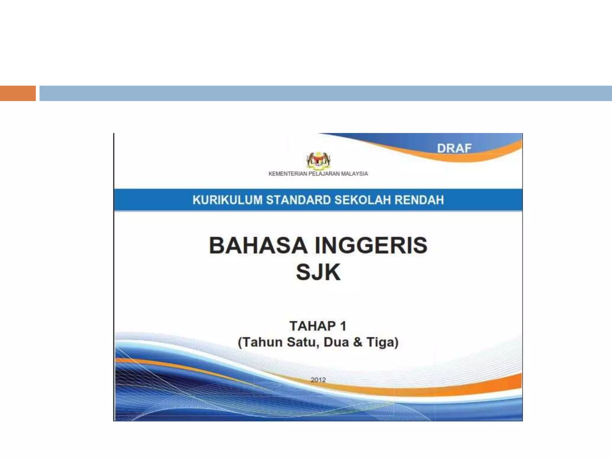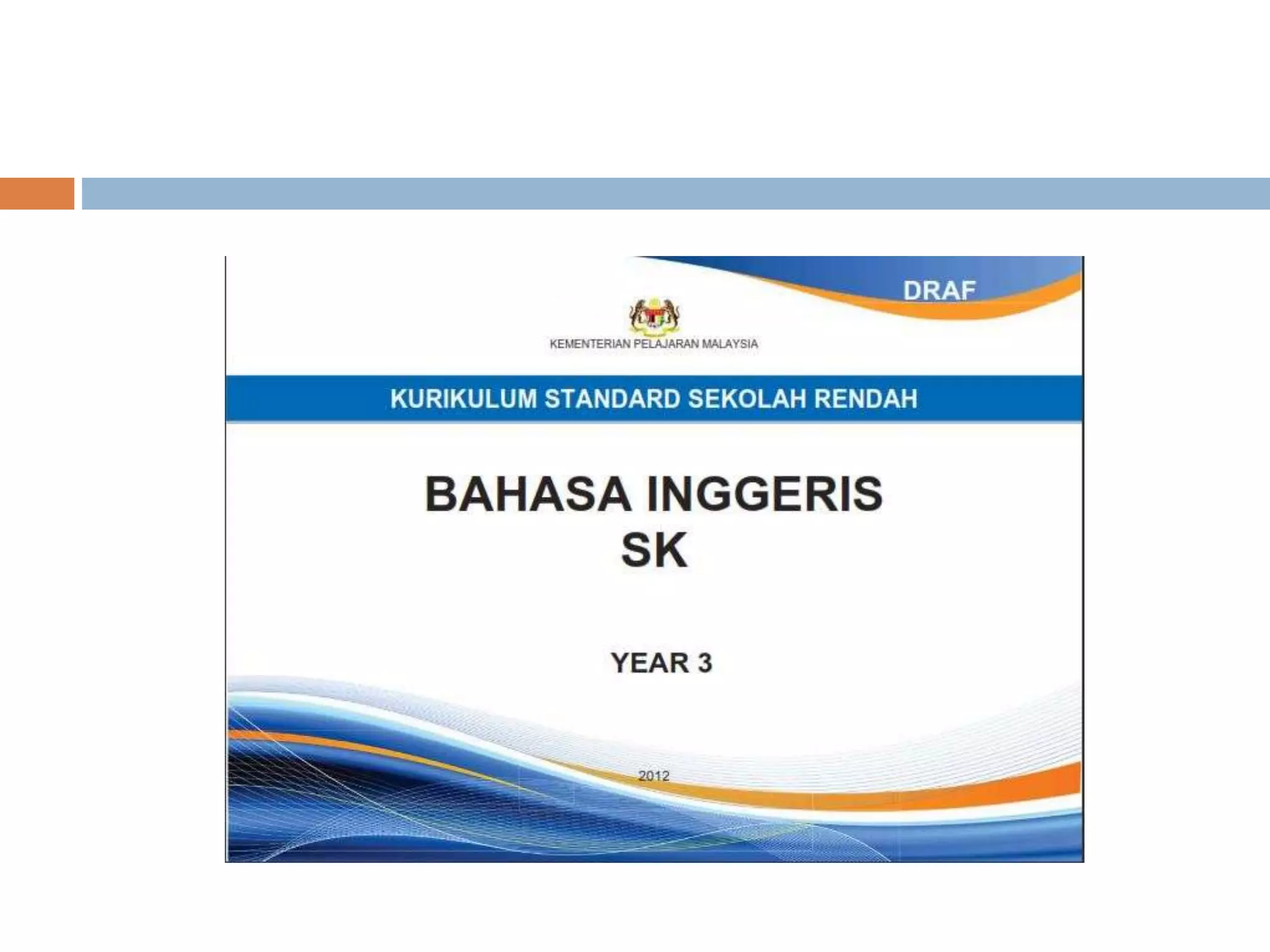 This document outlines the Bahasa Inggeris (English language) curriculum standards for primary schools in Malaysia called KSSR. It discusses important concepts like content standards, learning standards, and modular configuration. The curriculum is organized into three broad themes and focuses on language skills like listening, speaking, reading, writing, and grammar. It emphasizes a learner-centered approach and character building. Sample daily lesson plans provide examples of how the content and learning standards can be applied in the classroom with a focus on a particular language skill or theme.