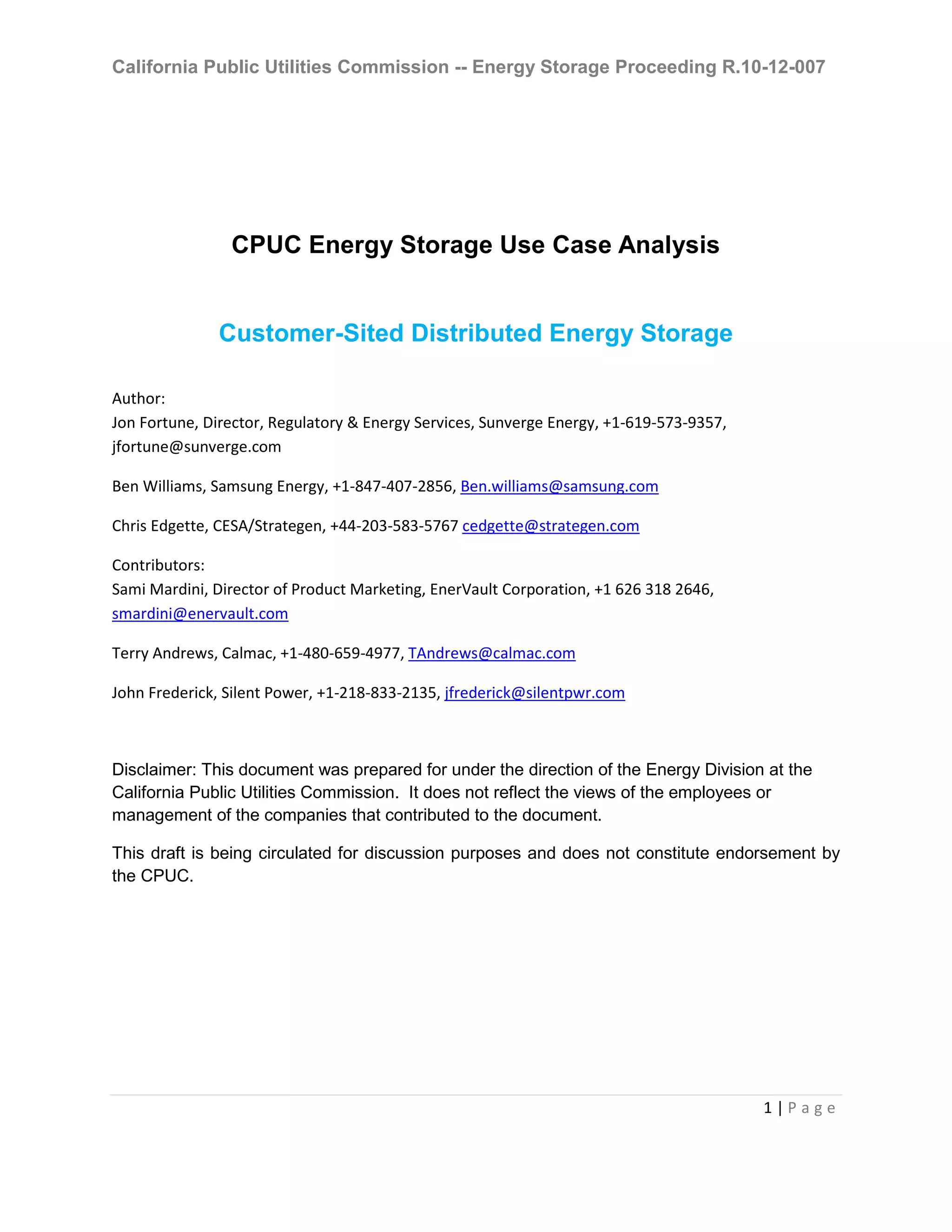 This document summarizes several use cases for customer-sited distributed energy storage in California. It describes how energy storage could be used to manage customer bills, allow market participation, and provide utility control. Key uses include reducing peak demand and energy costs for customers and helping utilities manage intermittent renewable generation and distribution grid operations. Policy changes around incentives, rates, and demand response programs could encourage more coordinated use of energy storage by both customers and utilities.