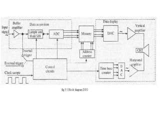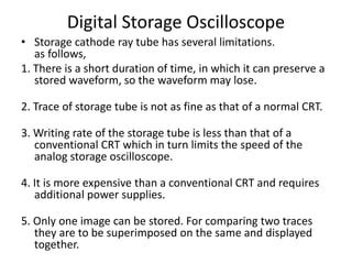 1. A digital storage oscilloscope converts analog signals to digital signals using an analog-to-digital converter and stores the digital data in memory.