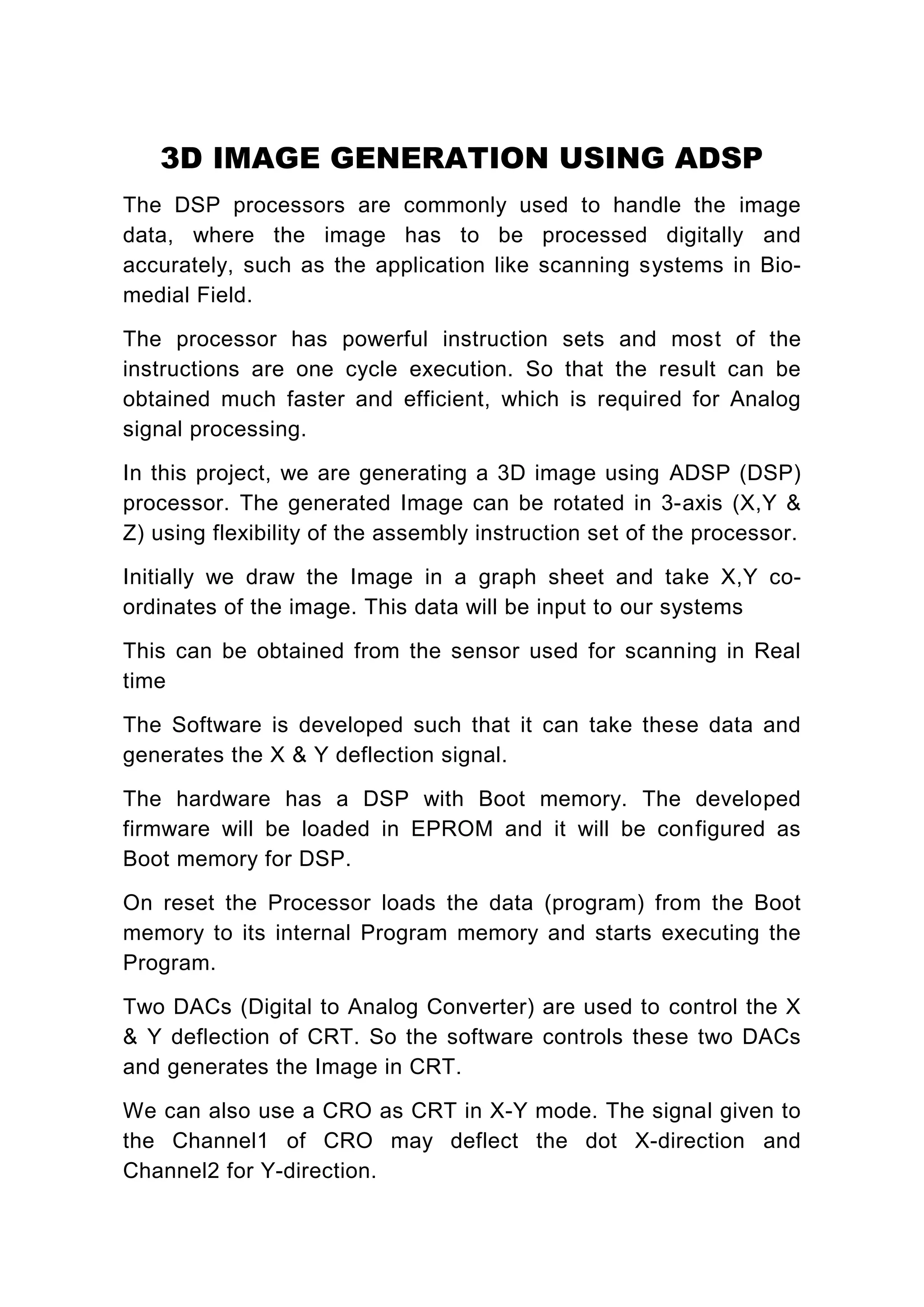 The document discusses using an ADSP processor to generate 3D images. It describes how the generated image can be rotated in three axes using the processor's assembly instruction set flexibility. X, Y coordinates of the image are input and used to generate deflection signals that control DACs and produce the image on a CRT. The system loads a program from boot memory on reset to execute the image generation program.