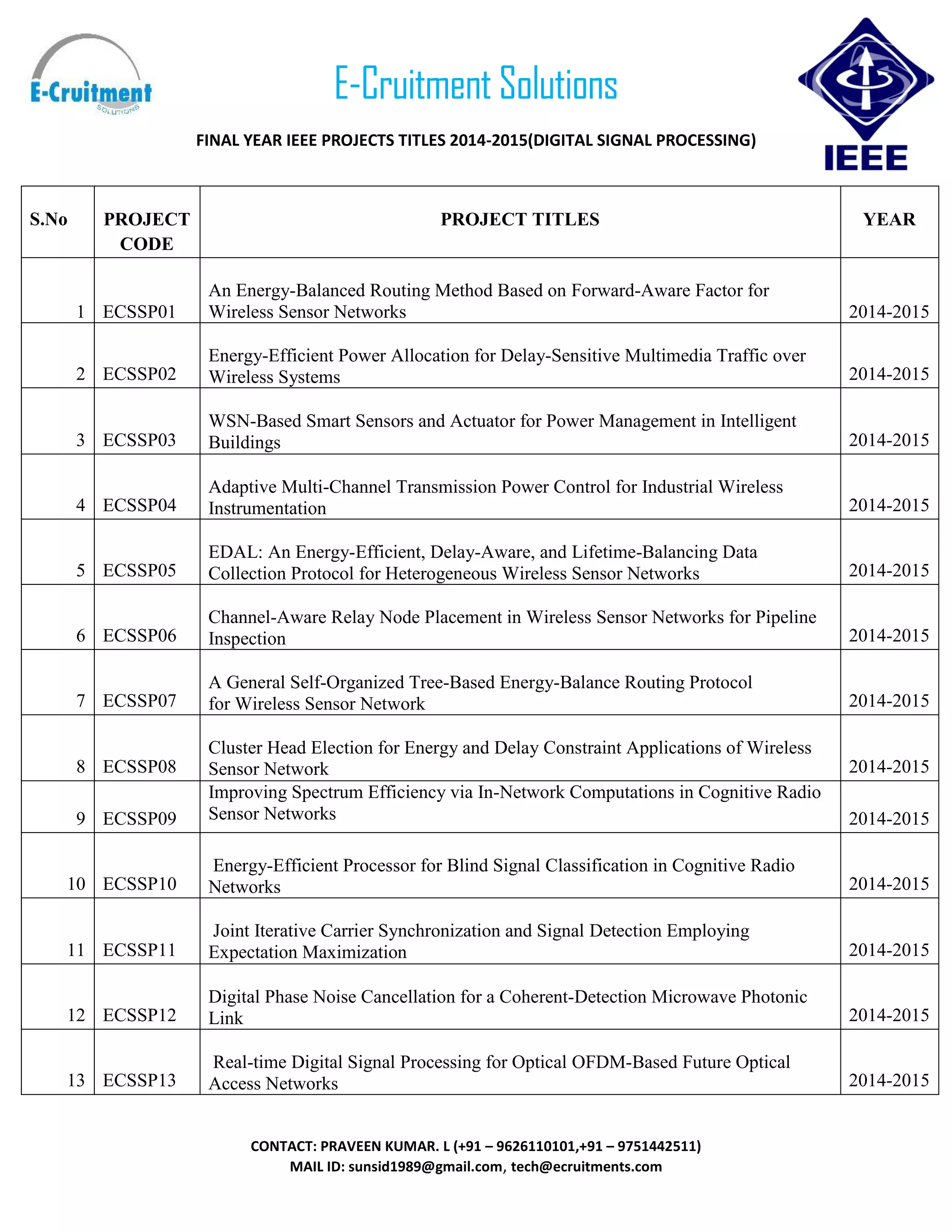 This document provides a list of final year IEEE project titles related to digital signal processing for the academic years 2014-2015, along with contact details for Praveen Kumar. The projects cover various topics including energy-efficient techniques, wireless sensor networks, and cognitive radio systems. A total of 50 project titles are outlined, each accompanied by a unique project code.