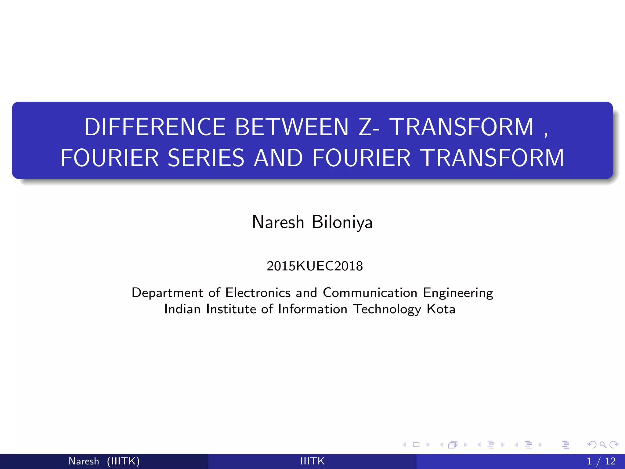 The document compares and contrasts the z-transform, Fourier series, and Fourier transform.