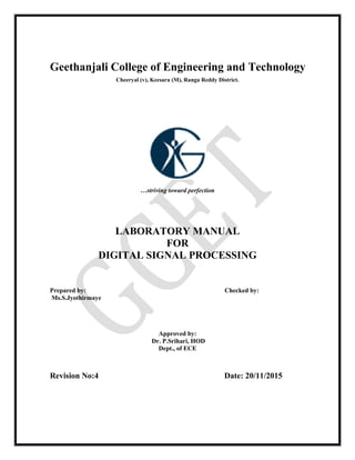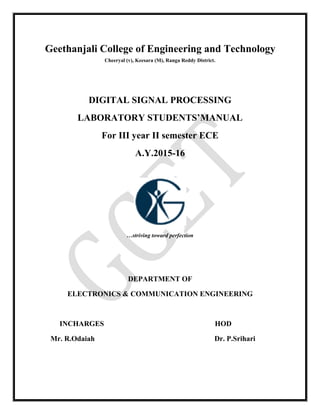This document provides information about the Digital Signal Processing laboratory at Geethanjali College of Engineering and Technology, including:
