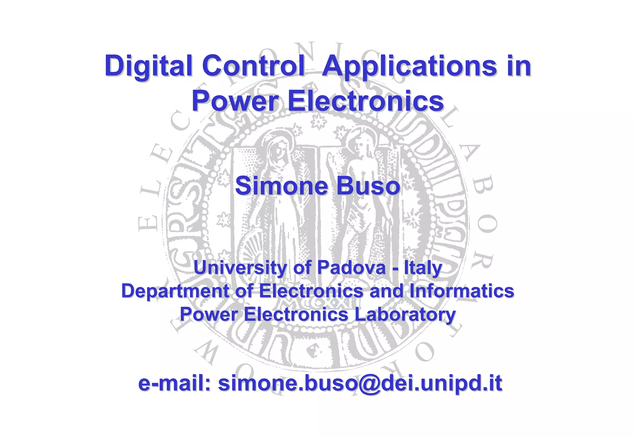 The document provides information on digital control applications using digital signal processors (DSPs) and microcontrollers (μCs) in power electronics. It discusses the advantages and disadvantages of digital control, available tools for implementation including DSPs and μCs, and features of DSPs and new DSP solutions that combine DSP capabilities with peripheral units typically found in μCs. Specific DSP solutions - the Analog Devices ADMC401 and Texas Instruments TMS320F240 - are described in detail including their core features, peripheral units, and software examples.