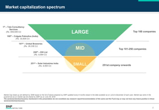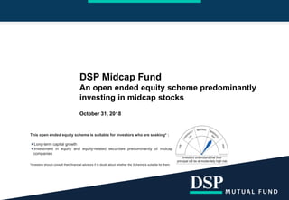 This document provides information on the DSP Midcap Fund, an open-ended equity scheme that predominantly invests in midcap stocks. The fund aims to generate long-term capital growth by investing in equity and equity-related securities of midcap companies. It follows a bottom-up stock selection process focused on quality companies with strong growth potential. The top 10 holdings are diversified across various sectors such as industrial products, banks, pharmaceuticals, and others. The document highlights the investment strategy, portfolio characteristics and risks associated with investing in midcap stocks.