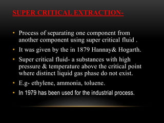 This document discusses two extraction processes: supercritical fluid extraction and aqueous two-phase extraction. Supercritical fluid extraction uses fluids above their critical point to separate components. It was developed in 1879 and is advantageous because it uses no organic solvents and allows continuous, rapid, and thermally gentle separation. Aqueous two-phase extraction separates molecules and particles into immiscible aqueous phases using polymers or salts. It provides a mild extraction method and allows selective separation of compounds like proteins. Both processes are used in food science, natural products, and pharmaceutical purification applications.