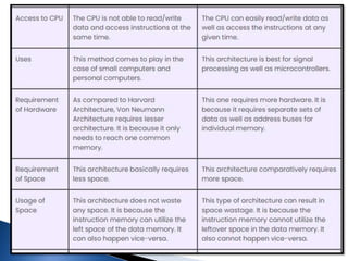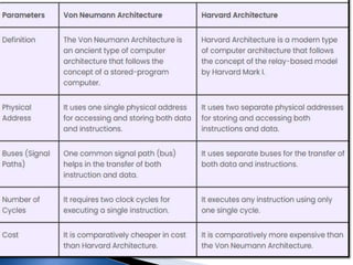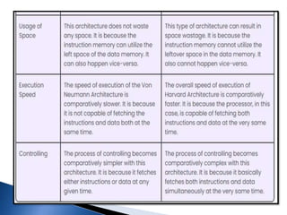 A digital signal processor (DSP) is a specialized microprocessor optimized for digital signal processing. DSPs have architectures designed for fast arithmetic operations and efficient data handling needed for tasks like audio processing. Common DSP features include instruction sets for single-instruction multiple-data operations, hardware looping for repetitive tasks, and pipelined execution to improve performance. DSPs are commonly used for applications involving digital audio, images, and communication signals.