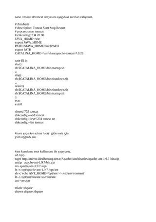 nano /etc/init.d/tomcat dosyasınaaşağıdaki satırları ekliyoruz.