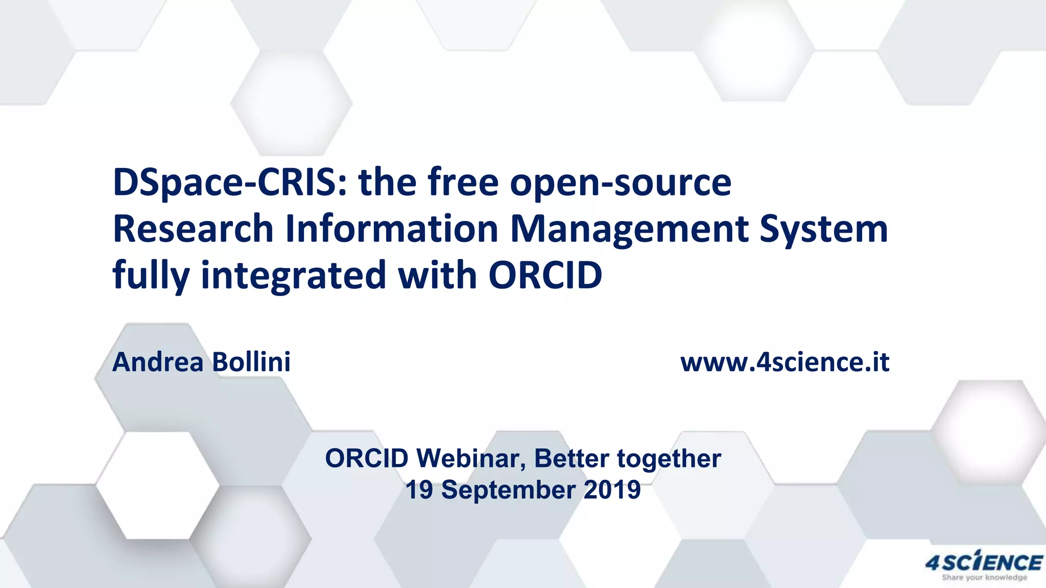 dspace-cris is an open-source research information management system that extends the capabilities of dspace to manage various research entities and their relationships. It integrates with ORCID for researcher profiles and offers features to manage publications, grants, and metrics across multiple communities. The system supports numerous functionalities through public APIs, including profile creation, publication import, and link signposting to enhance researcher visibility.