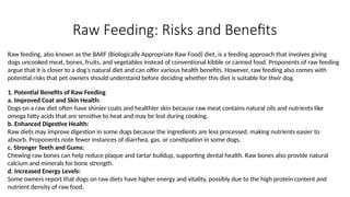 Raw feeding, also known as the BARF (Biologically Appropriate Raw Food) diet, involves feeding dogs uncooked meat, bones, and vegetables instead of traditional kibble or canned food. This approach can offer several benefits, including shinier coats, healthier skin, better digestion, stronger teeth, and a more natural intake of nutrients that may be lost during cooking. Many dog owners also report higher energy levels and improved overall vitality in dogs on a raw diet.