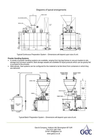 Gee & Company designs and installs polymer systems for flocculation and solid-liquid separation. They offer powder and emulsion-based systems that are customizable, quick to install, easy to operate, and monitored by PLC controls. Their experience in chemical dosing allows them to select the proper pumps and dosing equipment for each application.
