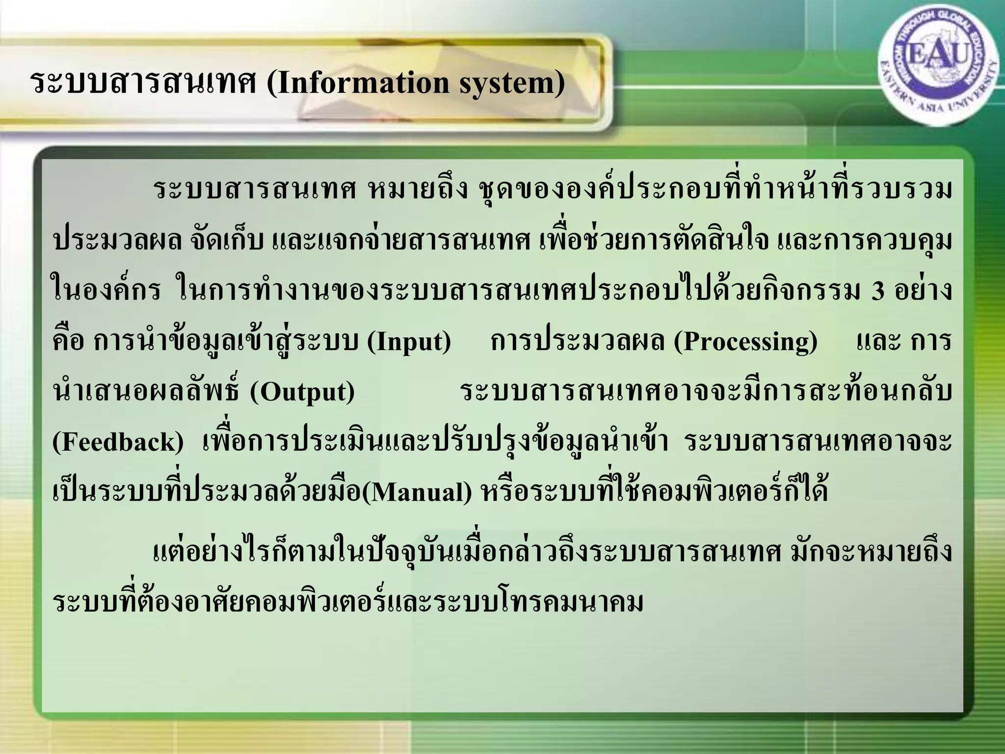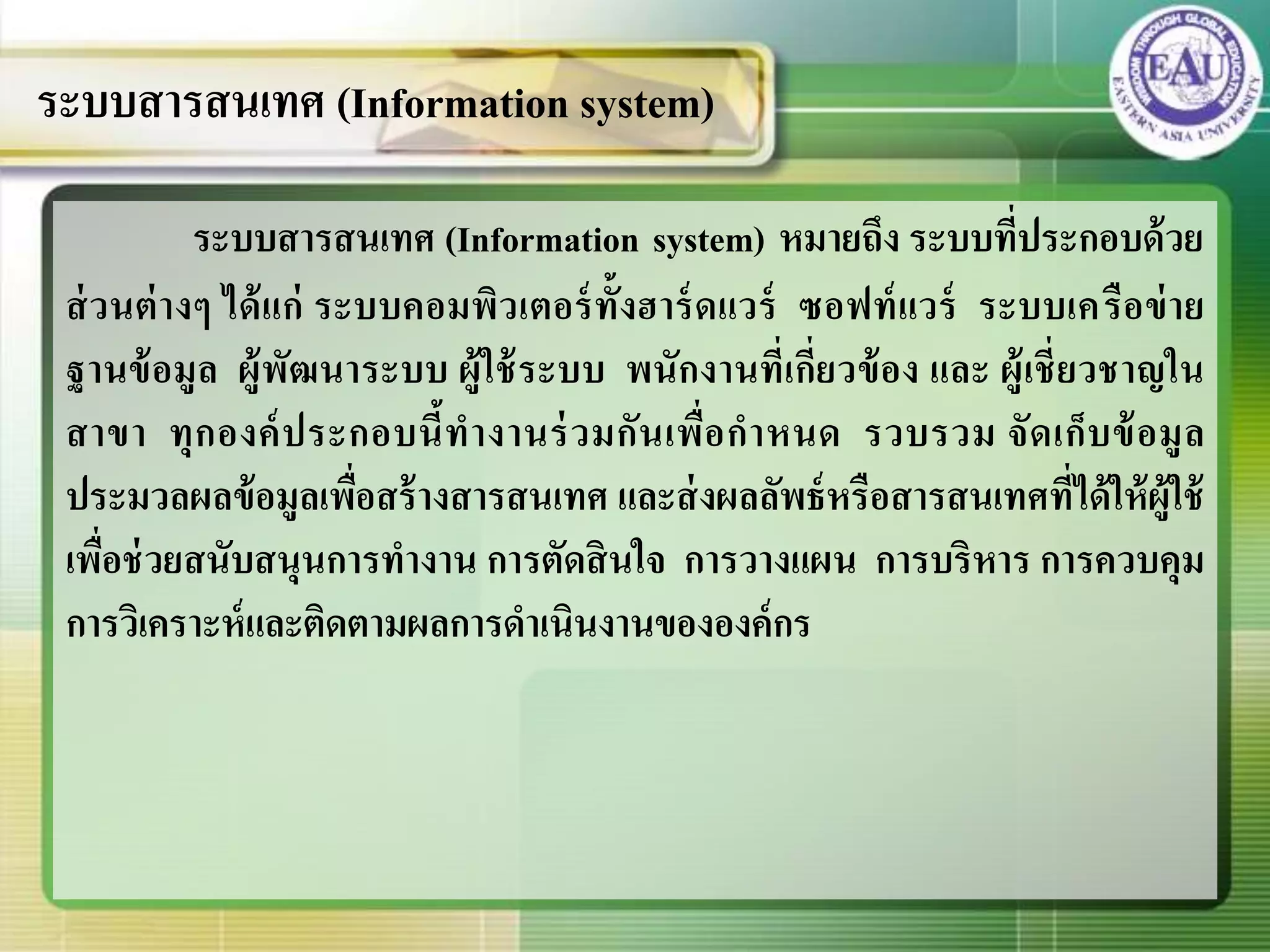 2. ระบบสารสนเทศ หมายถึง ชุดขององค์ประกอบที่ทาหน้าที่รวบรวม