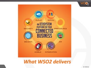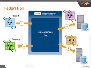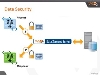The WSO2 Data Services Server provides a data access layer and APIs that allow applications to access and manage data from various data sources in a loosely coupled way. It offers open source data management capabilities with request/response encapsulation, data store configurations, and features for management and quality of service. The server exposes managed APIs and a data services layer to enable applications to retrieve and manipulate data from different data stores through a well-defined interface.