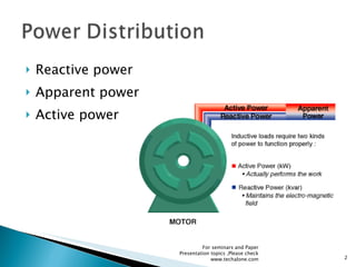 The document discusses power factor correction and reactive power compensation. It mentions issues like reactive power burden, high harmonic currents, unbalanced loads, and excessive neutral currents. It also discusses different reactive power compensation techniques like thyristor controlled reactor, thyristor switched capacitor, static VAR compensator, and advanced static VAR compensator. The document recommends checking www.techalone.com for seminar and paper presentation topics on electrical engineering issues like power factor correction, harmonics compensation, load balancing, voltage regulation, and neutral current compensation.