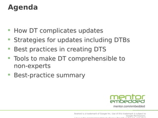The document outlines best practices for managing device-tree updates and ensuring long-term support and security in embedded systems, emphasizing the complexities of handling device trees (DTBs). It discusses strategies for maintaining compatibility between various configurations and drivers while introducing tools and methods for validating and managing device trees. The conclusion highlights the need for a standardized approach and the application of best practices to the kernel, acknowledging the challenges involved in driving change.