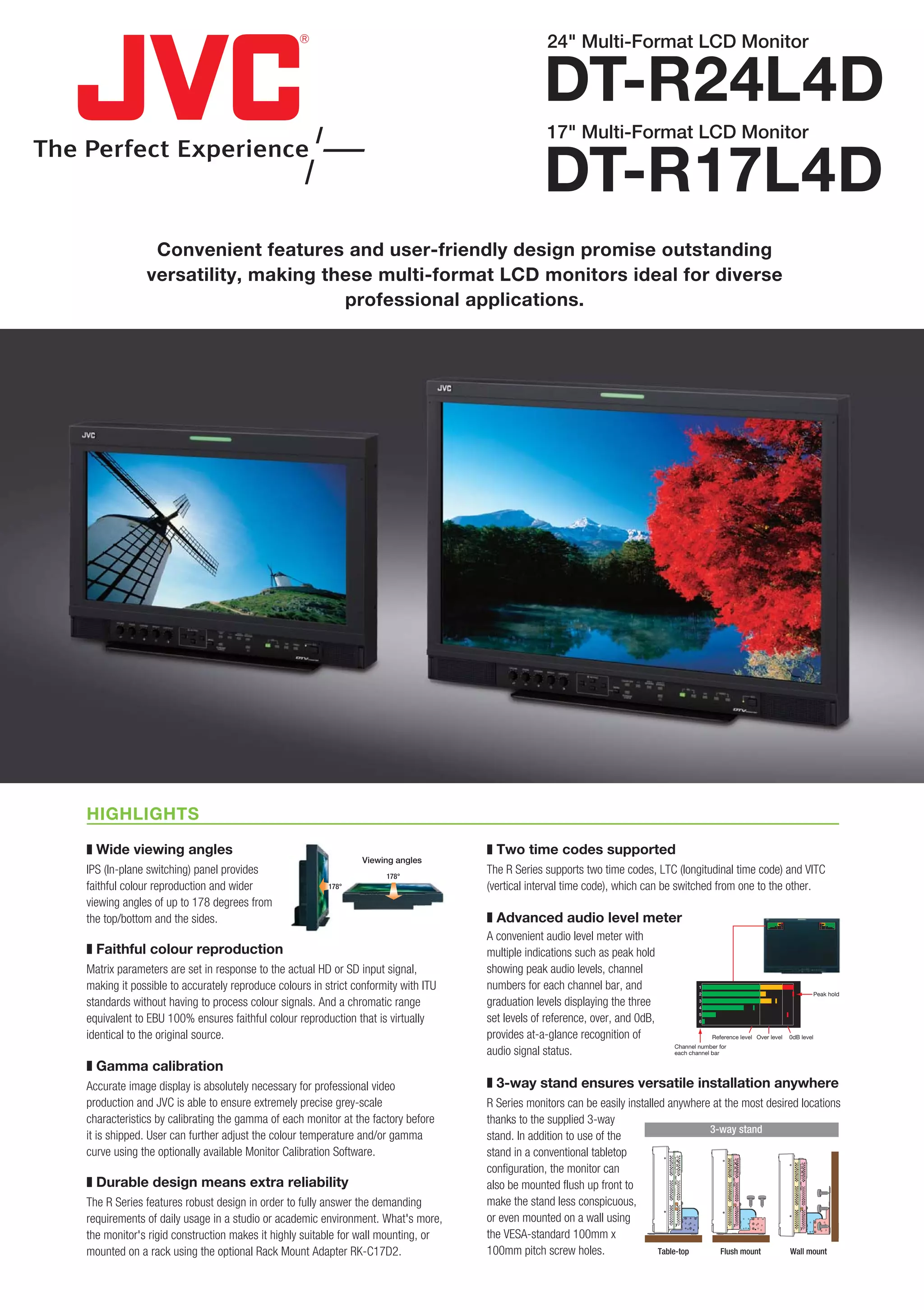 These multi-format LCD monitors from JVC feature wide viewing angles, faithful color reproduction, and gamma calibration. They support various video signals and two timecodes. Additional features include an audio level meter, durable design for reliability, and a 3-way stand for flexible installation options. The monitors are suitable for diverse professional applications in studios and academic environments.