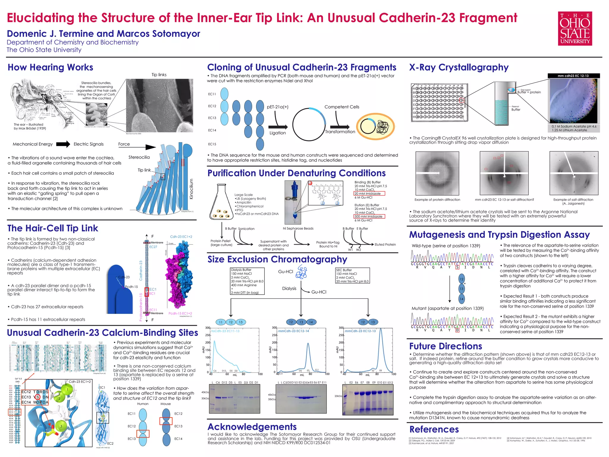 The document summarizes research on elucidating the structure of the tip link in the inner ear, which is important for mechanotransduction and hearing. The tip link is formed by two cadherin proteins, Cadherin-23 and Protocadherin-15, which interact tip-to-tip. The researchers cloned and purified fragments of the unusual Cadherin-23 protein under denaturing conditions to further study its structure and calcium binding sites, which are important for the protein's elasticity and function within the tip link. Future work will investigate how variations in calcium binding sites may affect the overall strength and structure of the tip link complex.