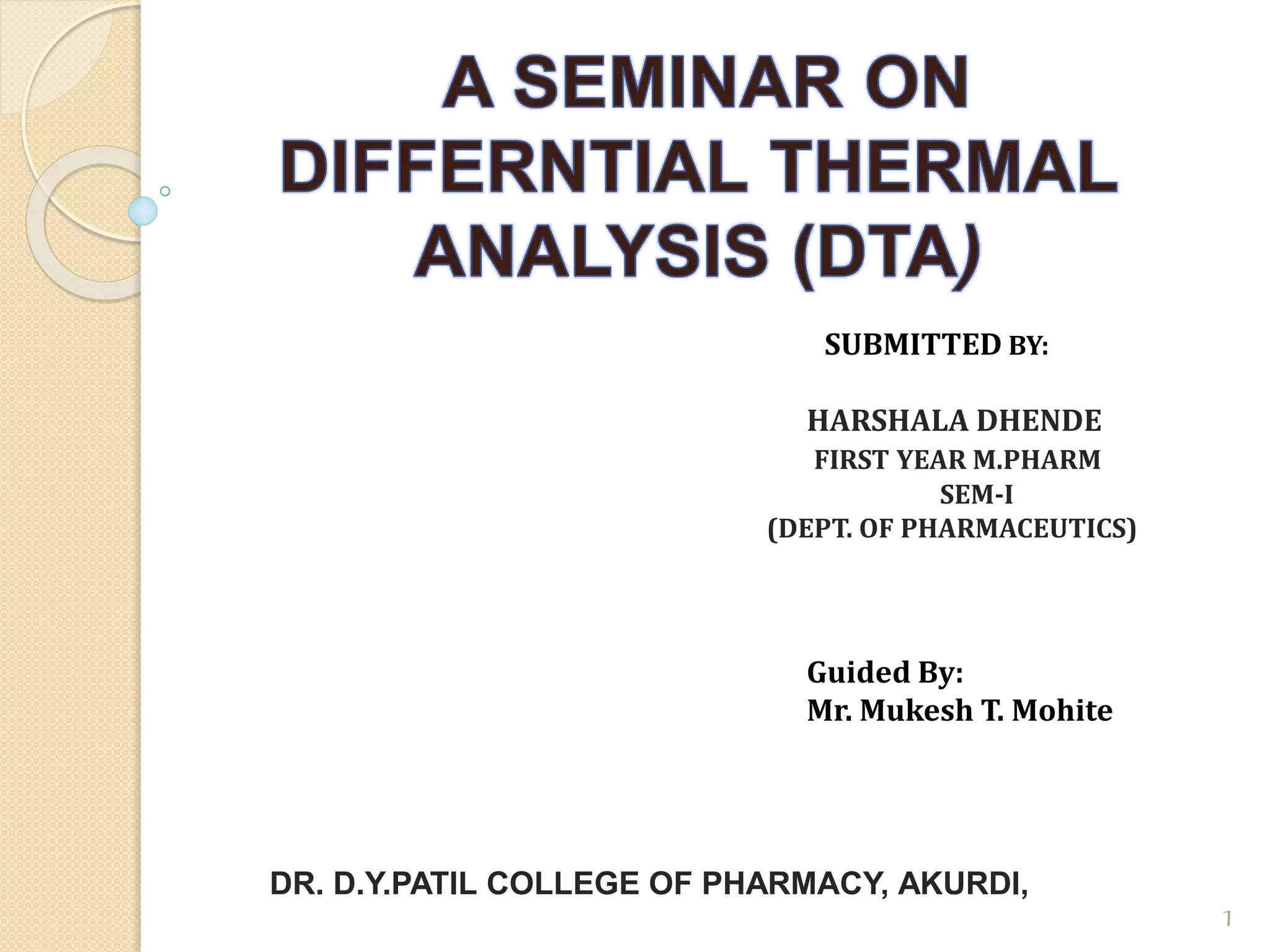 Thermal analysis techniques such as differential thermal analysis (DTA) measure the temperature difference between a sample and an inert reference material as they undergo identical thermal cycles. DTA provides information about physical and chemical changes in a material as it is heated, such as melting, crystallization, and decomposition, by detecting endothermic or exothermic reactions. The DTA instrument consists of sample and reference holders connected to thermocouples within a furnace. Changes in the sample are detected as differences in temperature compared to the unreactive reference. DTA is useful for characterizing materials like minerals, polymers, and pharmaceuticals.