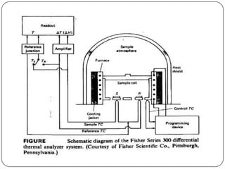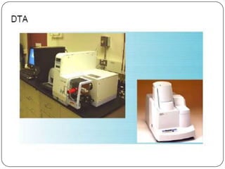 Thermal analysis techniques measure properties of a sample as a function of temperature. Differential scanning calorimetry (DSC) measures the heat flow into or out of a sample relative to a reference as both are heated. DSC can identify phase transitions like melting or glass transitions through endothermic or exothermic events. Common applications include determining melting points, characterizing materials, and analyzing polymer mixtures. DSC provides both quantitative and qualitative information about physical and chemical changes.
