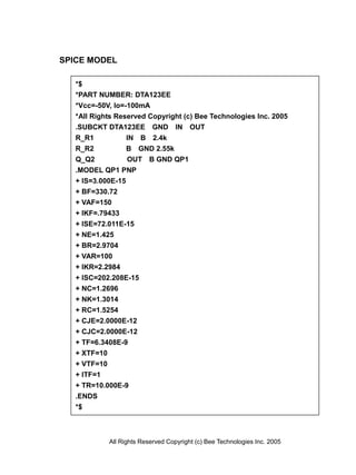 This document contains a SPICE model for the DTA123EE transistor from manufacturer ROHM. It includes the model parameters for the PNP bipolar junction transistor as well as simulation results comparing the transistor's ON characteristics, OFF characteristics, and DC current gain to the datasheet specifications with errors less than 5%. Circuit simulations were performed to evaluate the transistor's performance under various operating conditions.