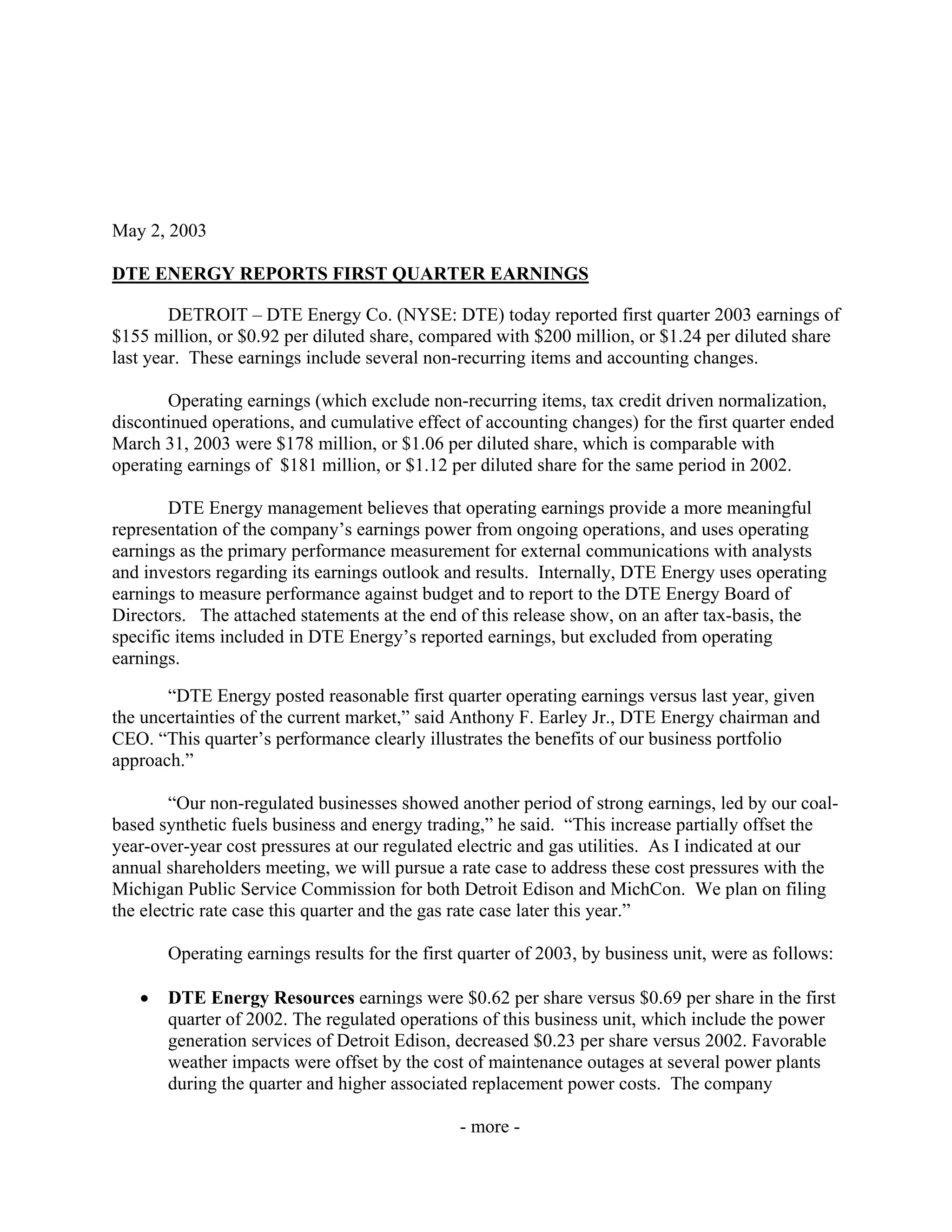 DTE Energy reported first quarter 2003 earnings of $155 million compared to $200 million in the same period of 2002. Operating earnings, which exclude non-recurring items, were $178 million in the first quarter of 2003 compared to $181 million in the first quarter of 2002. The company's non-regulated businesses such as synthetic fuels production and energy trading saw stronger earnings compared to the prior year and helped offset higher costs at the company's regulated electric and gas utilities. DTE Energy affirmed its 2003 operating earnings guidance range of $3.75-$3.95 per share after adjusting for the sale of its transmission business.