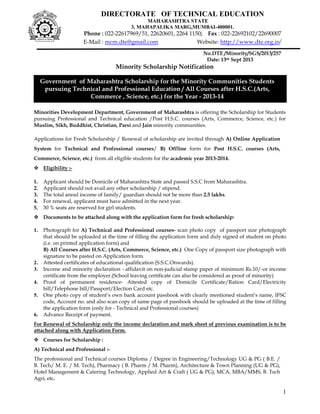 The document announces the Minority Scholarship offered by the Minorities Development Department of Maharashtra government for students from Muslim, Sikh, Buddhist, Christian, Parsi and Jain communities pursuing technical, professional and post-HSC courses for the 2013-2014 academic year. Eligible students must fill online or offline application forms along with required documents and submit them to their institutes by specified deadlines. Institutes will then scrutinize and forward the applications to the relevant authorities by additional deadlines for generating merit lists and disbursing scholarships into students' bank accounts.
