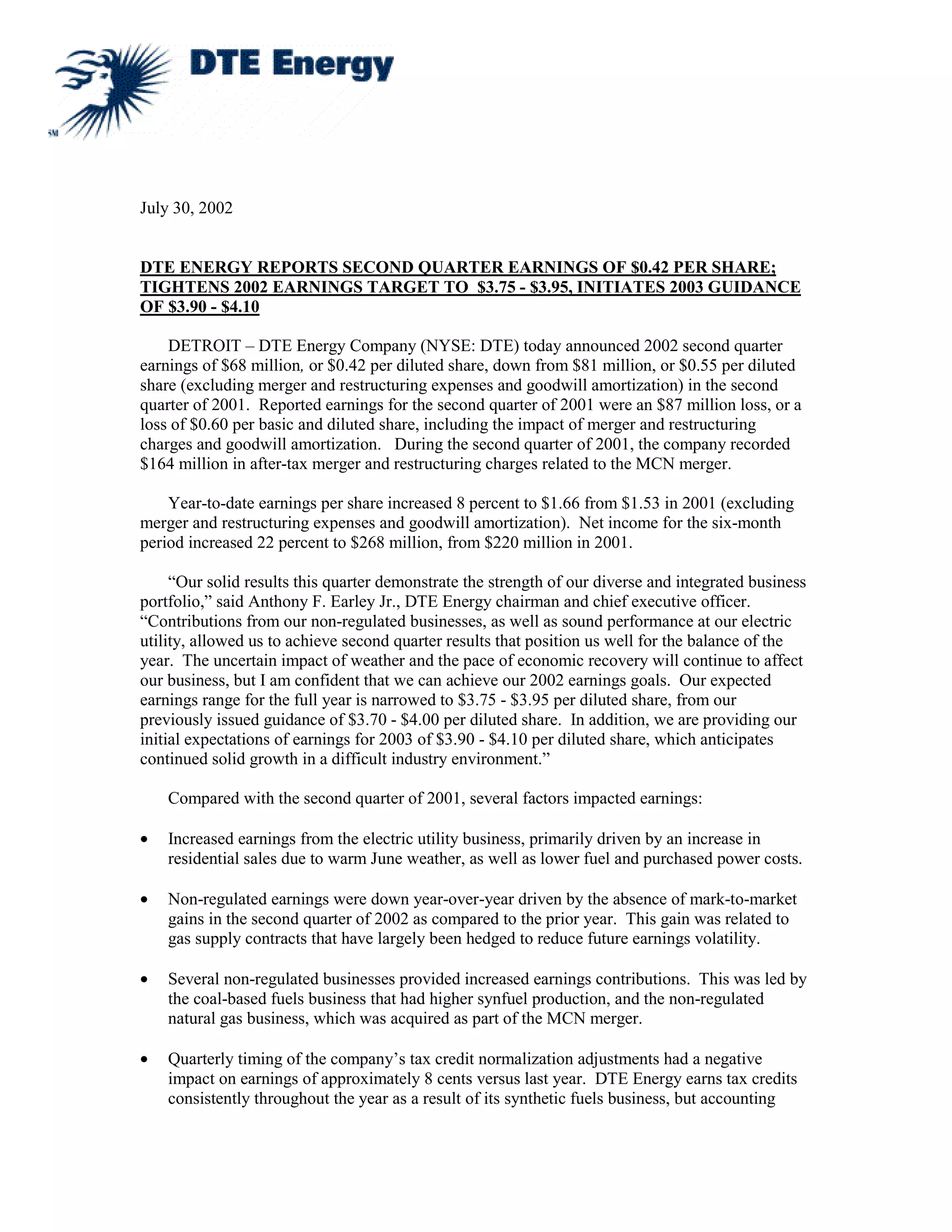 DTE Energy reported second quarter earnings of $0.42 per share, down from $0.55 per share in the second quarter of 2001, excluding merger and restructuring expenses. For the first six months of 2002, earnings per share increased 8% compared to 2001. DTE Energy narrowed its full-year 2002 earnings guidance to $3.75-$3.95 per share and initiated 2003 guidance of $3.90-$4.10 per share. Solid performance from the electric utility and contributions from non-regulated businesses such as coal-based fuels helped achieve results despite uncertain impacts from weather and economic conditions.